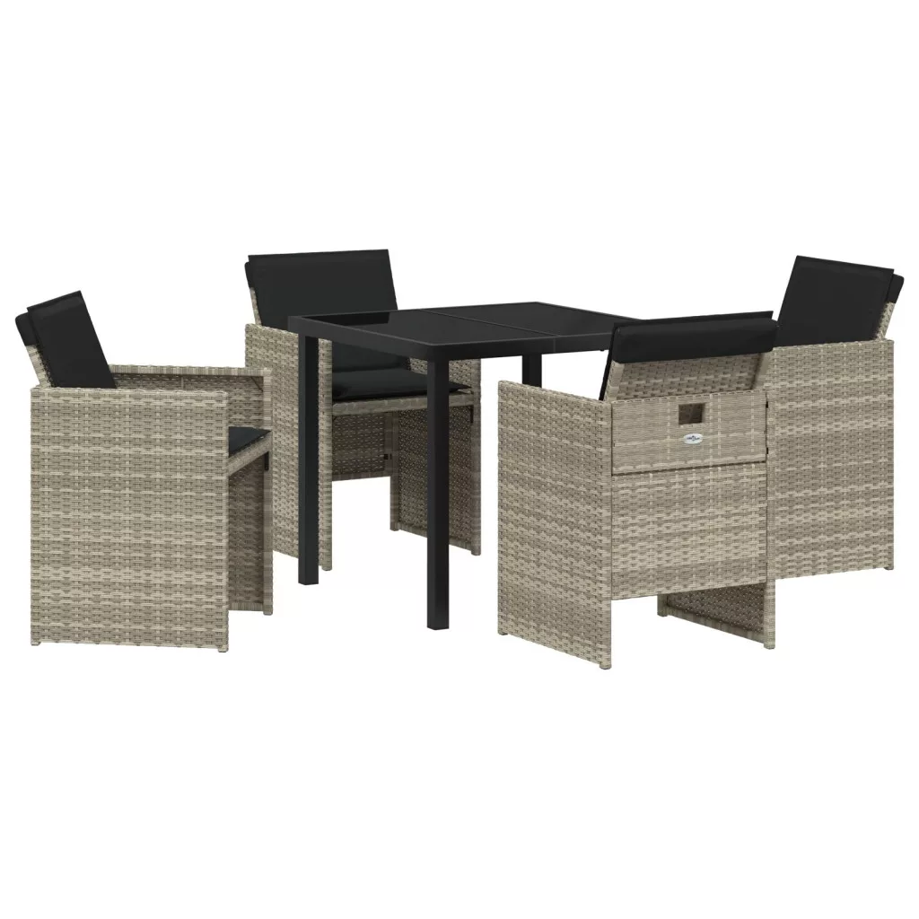 - Beépített elemek: A masszív asztal mellett székek is tartoznak hozzá, melyek polirattán karfákkal és sima üveg asztallapokkal látják el a kényelmet és stílust. Minden szék időjárásálló kültéri párnákkal van ellátva, hogy kényelmes étkezési élményt nyújtson. Az elemek jól illeszkednek egymáshoz, fokozva a felhasználói kényelmet.
