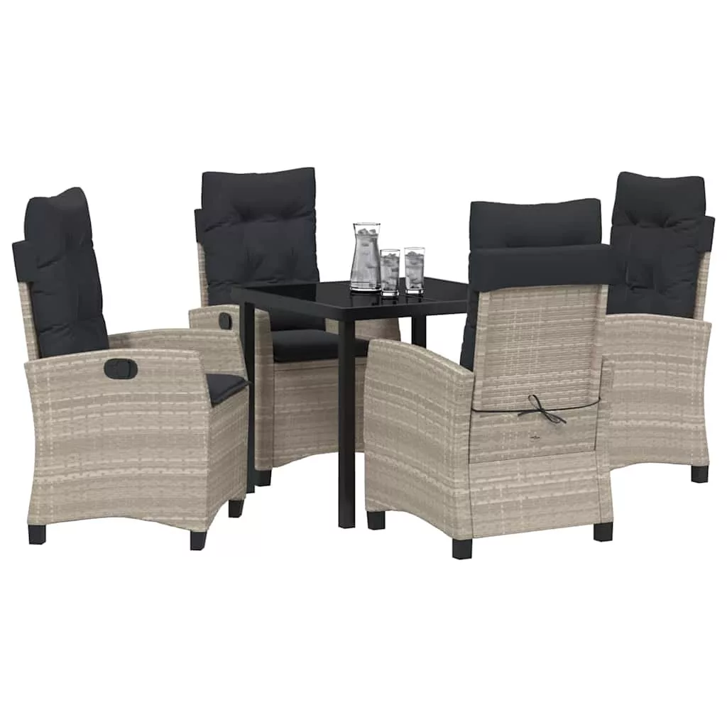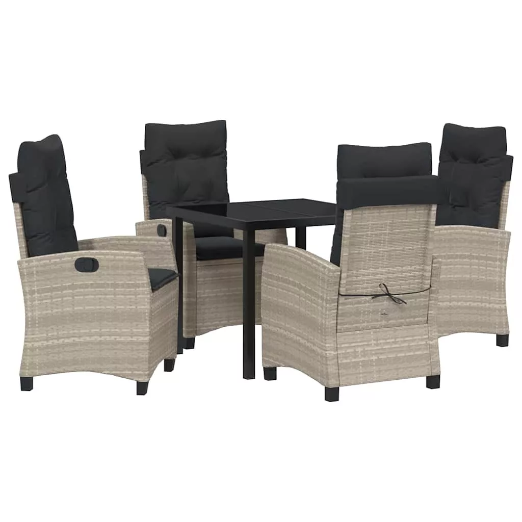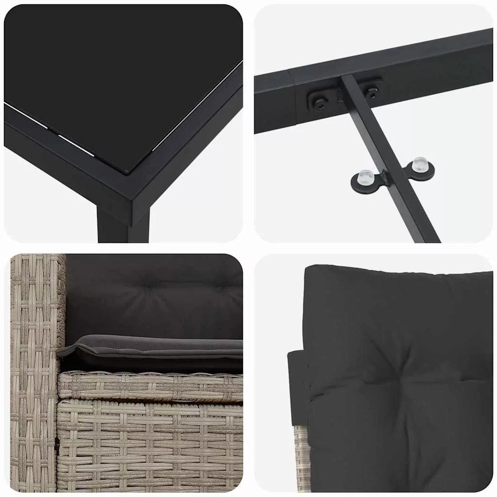 - Anyagok: Polirattanból és tartós acélból készült, így a szett elegáns és tartós. A polirattan védi az UV és időjárás ellen, ideális napos helyekre, míg az acélváz erős alapot ad.