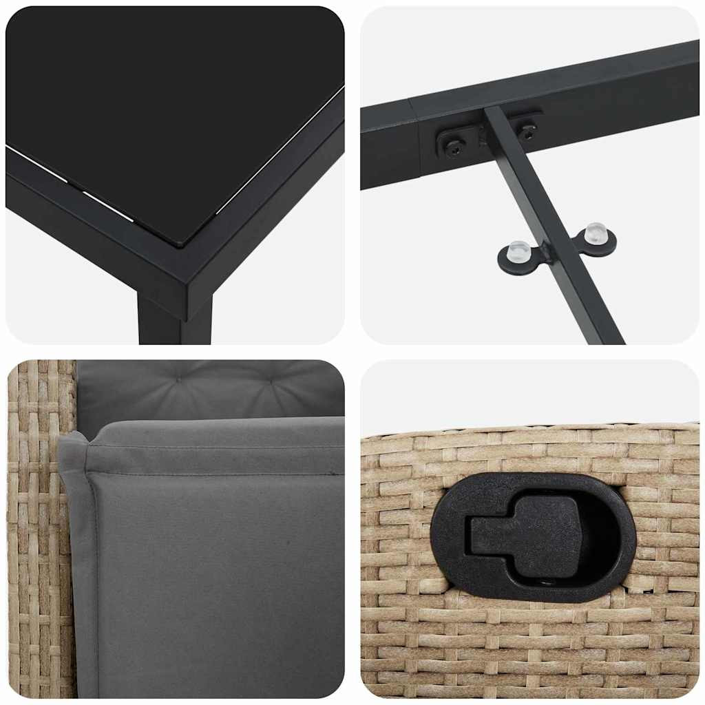 - Ajánlott használat: Tökéletes nyári használatra kertekben vagy teraszokon, ez a szett sokoldalú ülőhelyet teremt a vacsorákhoz vagy bulikhoz. Modern stílusa feldobja bármely kültéri teret, barátságos menedékké alakítva, legyen szó baráti találkozókról vagy ünnepekről.