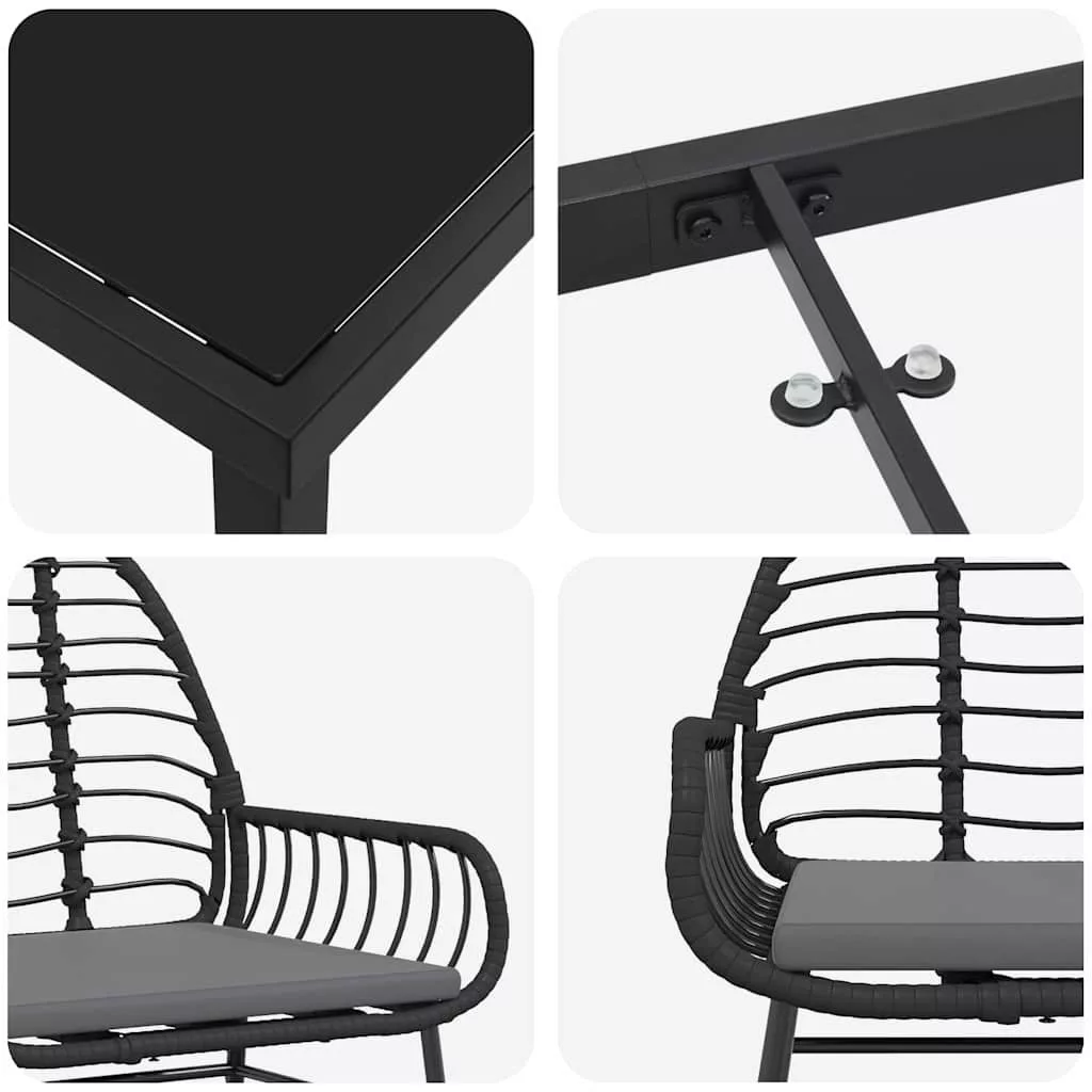 - Anyagok: A Poli Rattan könnyű és strapabíró, így bármilyen időjárási körülménynek ellenáll. A porfestett acél keret erős és megbízható, megőrzi a szett megjelenését és tartósságát.