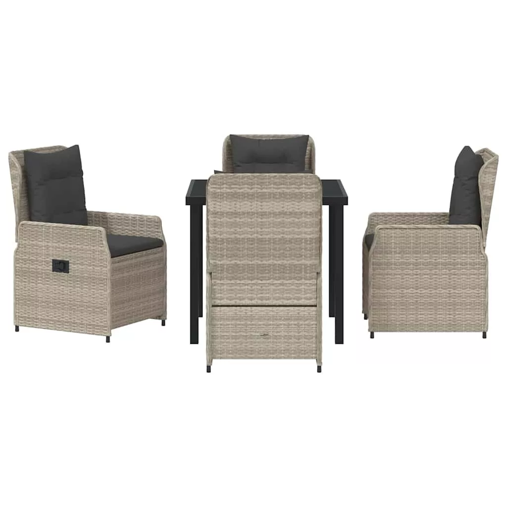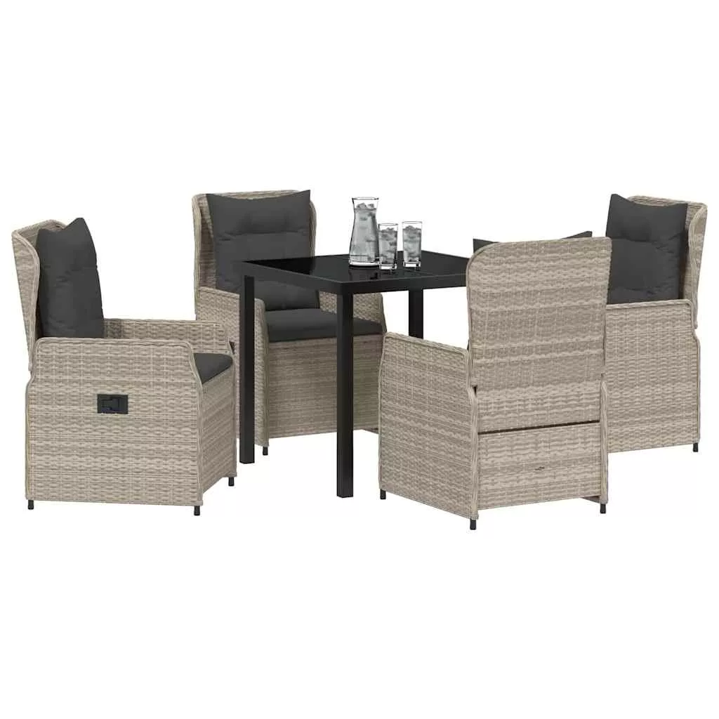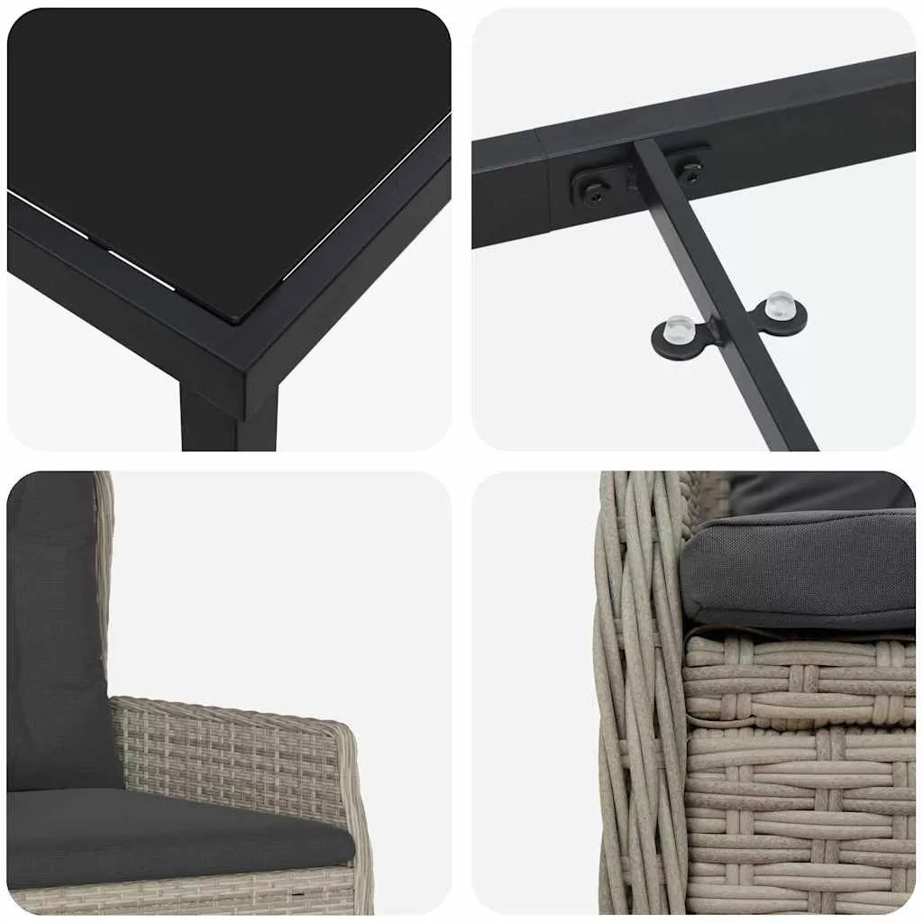 - Tartós szerkezet: Ezt a kerti étkező szettet hosszú távú használatra tervezték, polirattanból készült, ami bírja a különböző időjárási viszonyokat. Masszív kivitele biztosítja a kényelmet és stabilitást minden használat során.