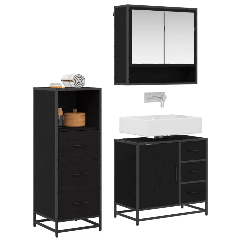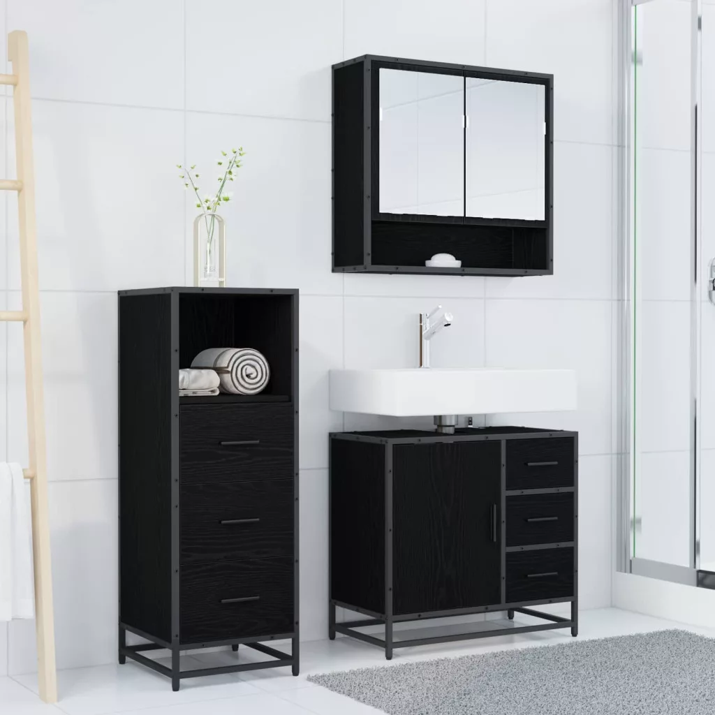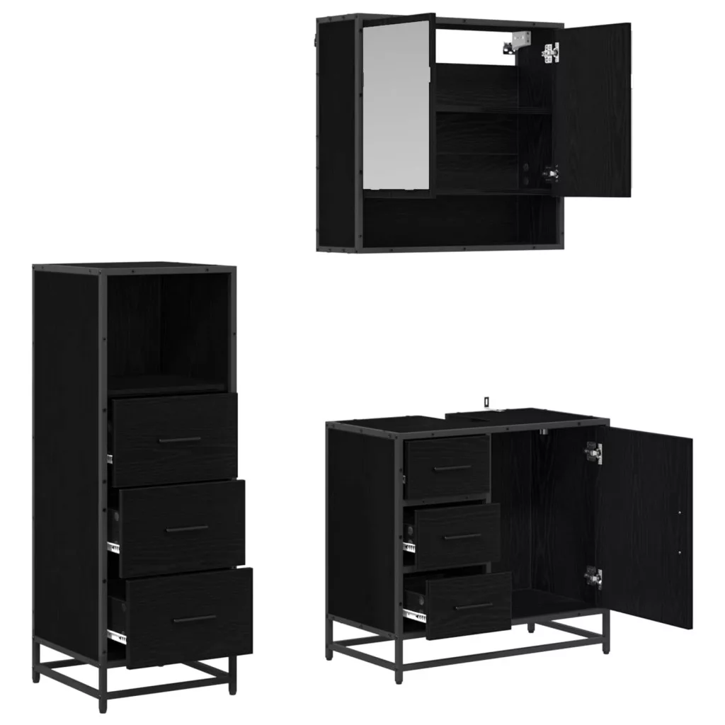 - Beépített alkatrészek: A szett tartalmaz egy síktükörszekrényt, egy mosdószekrényt és egy fürdőszobai szekrényt, mindezen tárolási lehetőségekkel a fürdőszobai alapvető dolgaihoz. A kabinok sima felületeknek köszönhetően rendezettek és jól szervezettek. A fekete fém poszt lábak stabil támasztékot és figyelemfelkeltő megjelenést biztosítanak a szetthez.