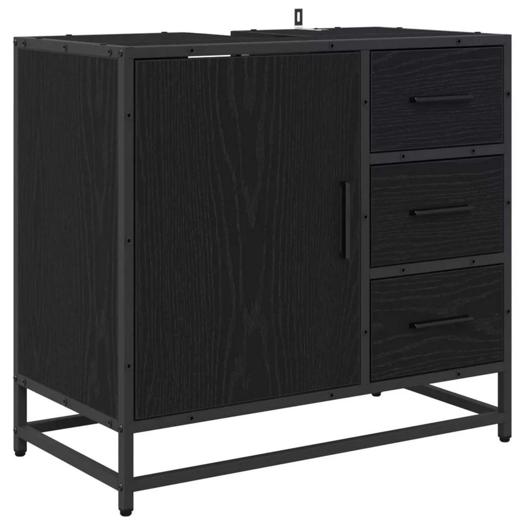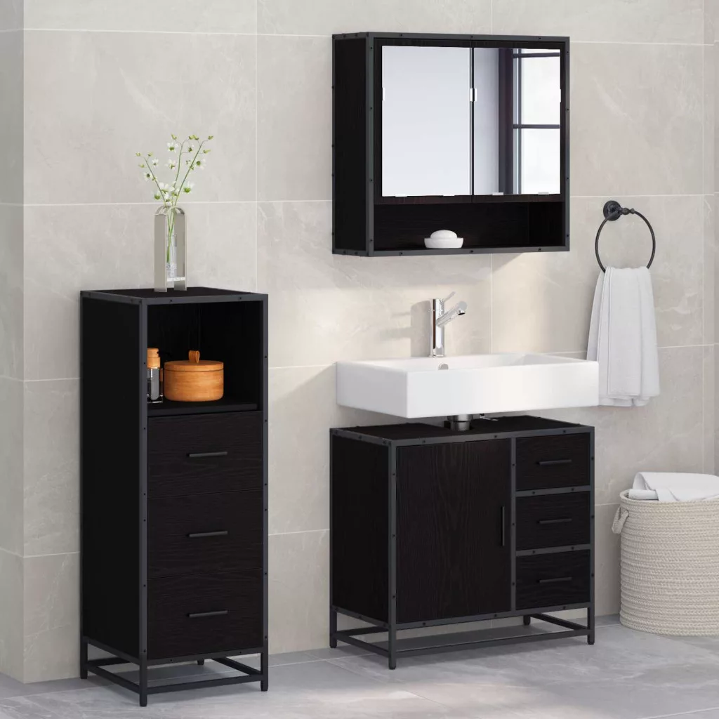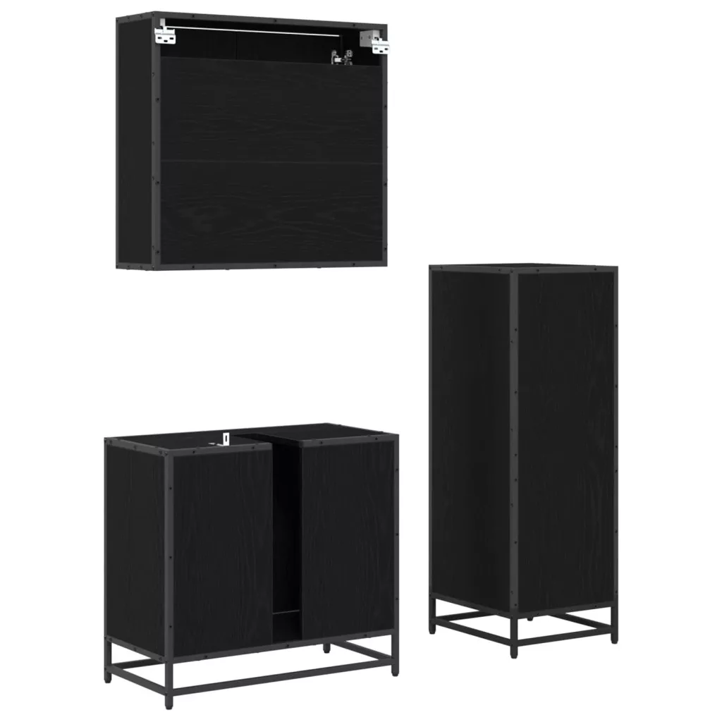 - Beépített alkatrészek: A szett tartalmaz egy síktükörszekrényt, egy mosdószekrényt és egy fürdőszobai szekrényt, mindezen tárolási lehetőségekkel a fürdőszobai alapvető dolgaihoz. A kabinok sima felületeknek köszönhetően rendezettek és jól szervezettek. A fekete fém poszt lábak stabil támasztékot és figyelemfelkeltő megjelenést biztosítanak a szetthez.