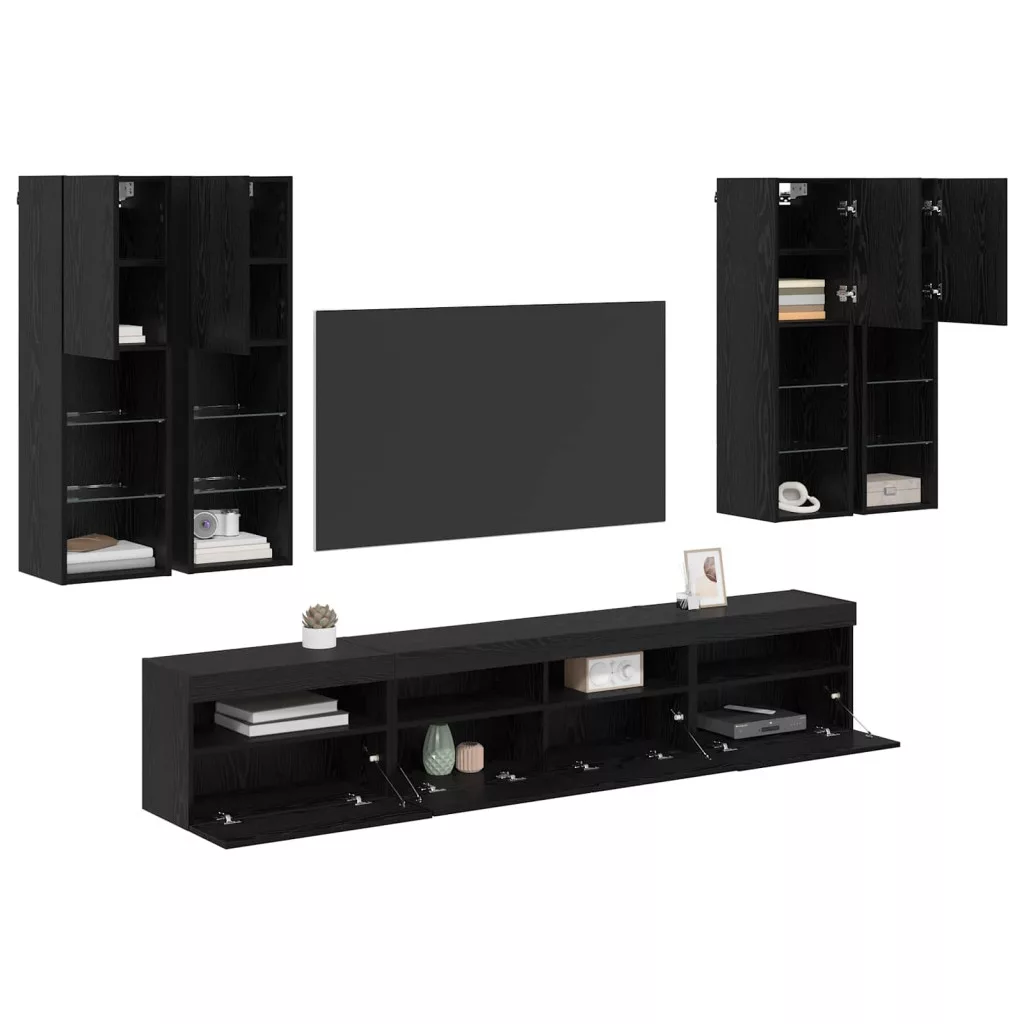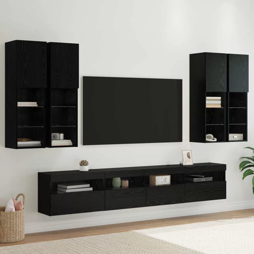- Teljes szett: A hét darabból álló szett bőséges tárolást nyújt polcokkal, zsanéros ajtókkal és rekeszekkel. Tökéletes a különböző médiakészülékek és kiegészítők rendezésére, egy elegáns és praktikus megoldásban.