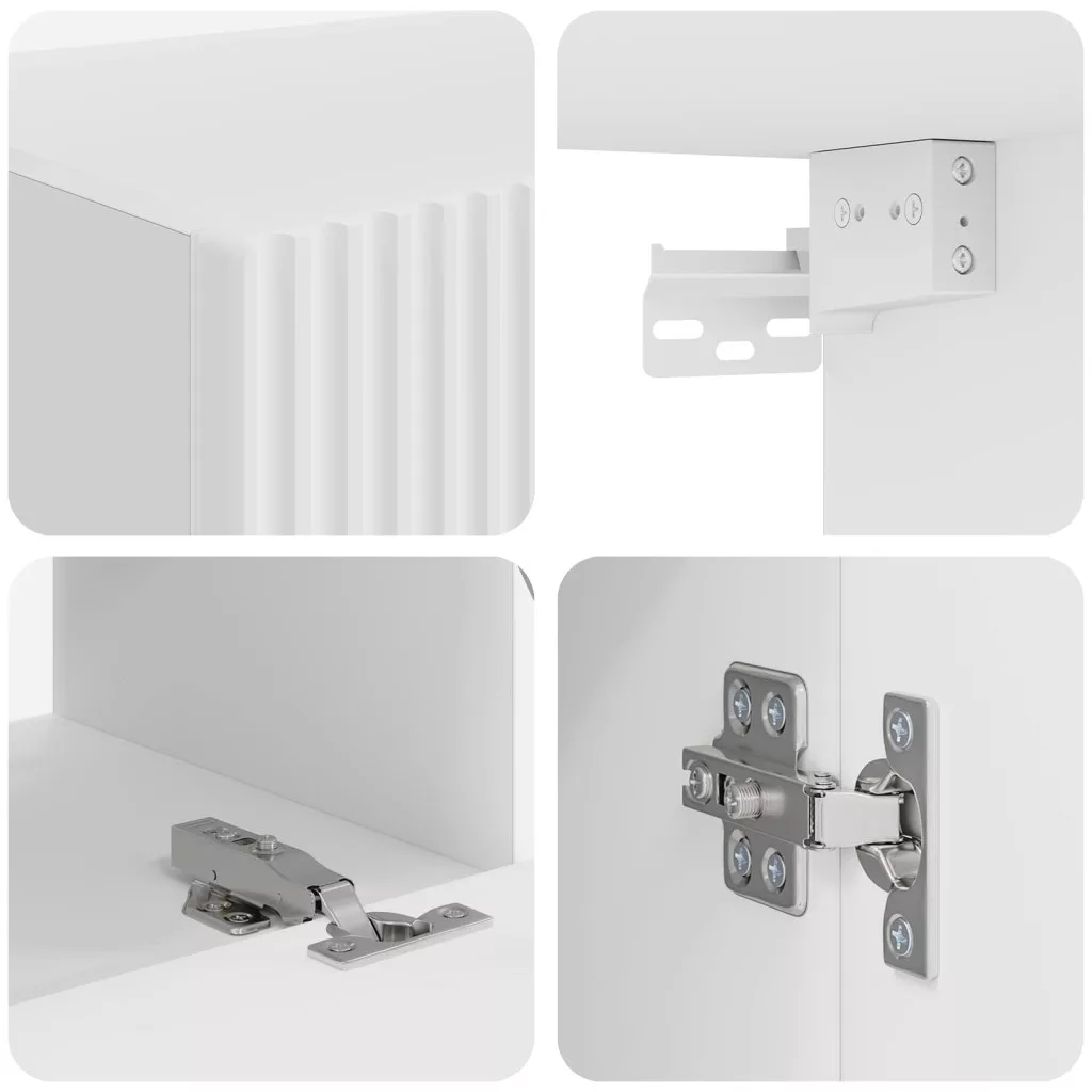 - Praktikus tárolóelemek A szett falra szerelhető polcokat és 90°-os lengőpántos ajtókat tartalmaz, amik széles tárolási lehetőséget kínálnak a kütyük, könyvek és dísztárgyak számára. Ezek az elemek segítenek a tér rendezettségében és elérhetőségében, ami a praktikummal és eleganciával foglalkozik. Minden ajtó simán nyílik, így könnyedén hozzáférhetsz a tárolt dolgokhoz.