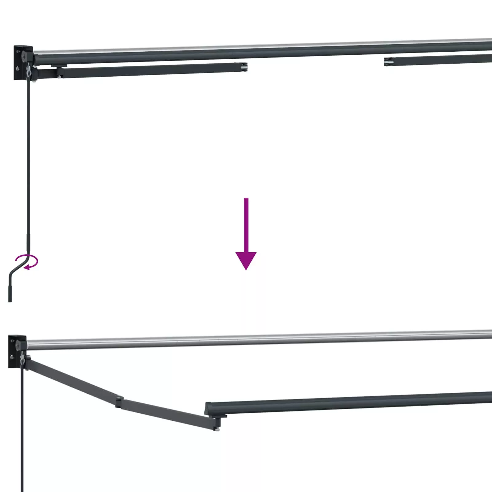 - Kézi működés: Konyhai fogantyúval felszerelt, lehetővé téve a napellenző kézi kinyújtását vagy behúzását. A falra szerelt dizájn segít a felhasználóknak, hogy az árnyékot a napfényhez állítsák.