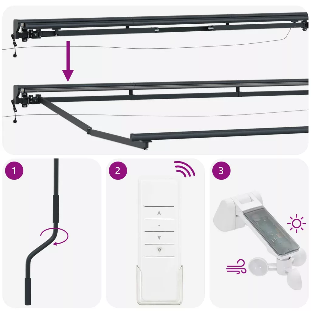 - Zökkenőmentes Működés: Távirányítóval és manuális karos vezérléssel biztosítja a rugalmas árnyékolást a kedved szerint. Akár gyorsan állítod be az árnyékot, akár lazán hangolod, ez az árnyékoló mindig flottul működik.