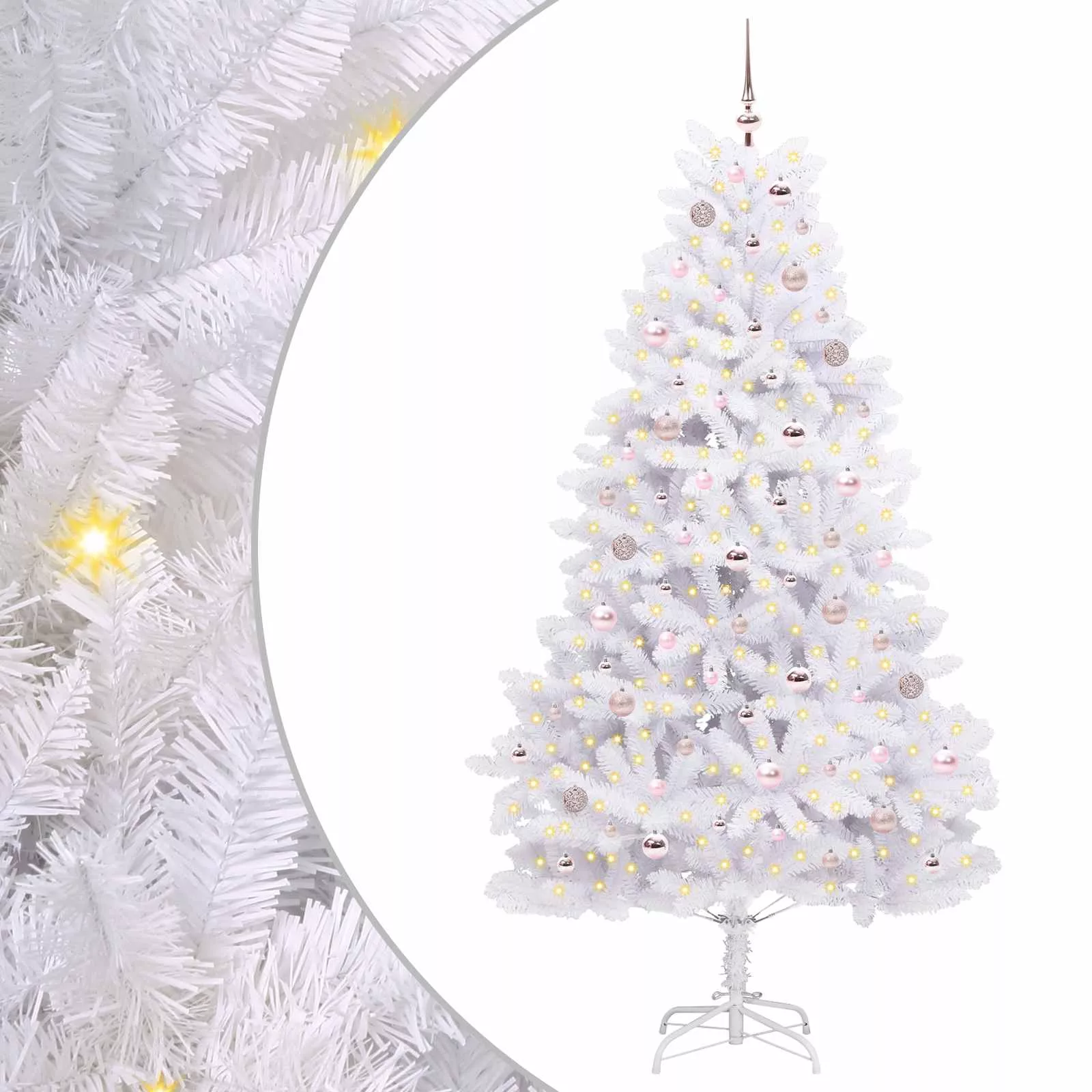 - Anyagok: Prémium PVC-ből és erős acélból készült, így ez a mesterséges fa tartós és valósághű megjelenést biztosít szezonról szezonra. A PVC puha, és igazán fenyőfára hasonlító érzetet ad, míg az acél stabilitást nyújt, így a fa megbízható és bájos.