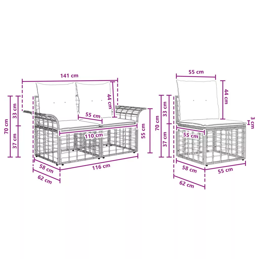 - Tartós acélváz: A kanapénk porfestett acélvázat tartalmaz, ami megbízható és robosztus struktúrát ad. Ez a modern megjelenés jól passzol a poly rattan elemekhez.