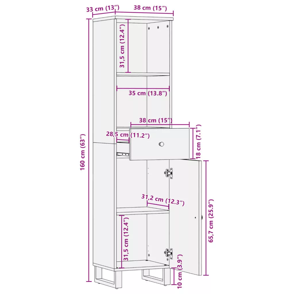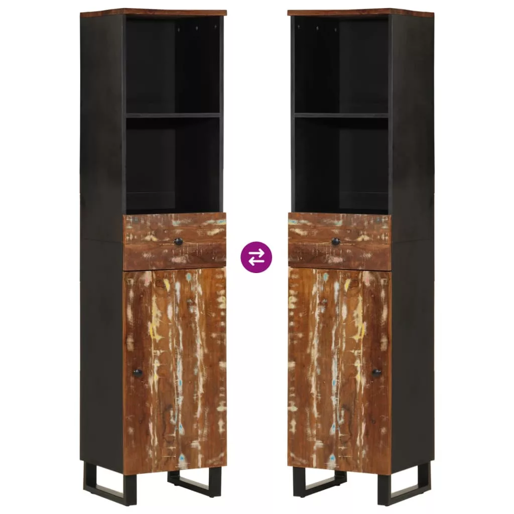 - Tömör újrahasznosított fa: Ez a fürdőszobaszekrény tömör újrahasznosított és szerelt fából készült. A tömör újrahasznosított fa újból felhasznált faanyagból áll, mint például tíkfa, mangófa, fenyőfa és bükkfa. Ezeket a faanyagokat régi épületekből, például gyárakból, fészerekből és hajókból hasznosítják újra.