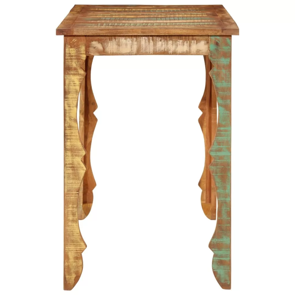 - Tartós anyag: A tömör újrahasznosított fa újból felhasznált faanyagokból, például tíkfából, mangófából, fenyőfából vagy bükkfából áll. Ezeket a faanyagokat régi épületekből, például gyárakból, fészerekből és hajókból hasznosítják újra. Mivel minden darab kézzel készült, a színek darabonként változhatnak.