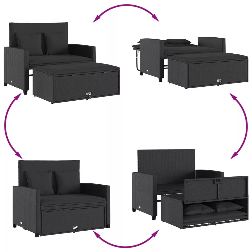 - Sokoldalú funkcionalitás: Ez a kerti bútor 2 személyes padként vagy kanapéként használható. Könnyedén ággyá alakítható, ha hátra dönti a háttámlát és kihúzza a zsámolyt a pad alól. A háttámlák mögötti tartópanelek stabilabbá teszik az ágyat.