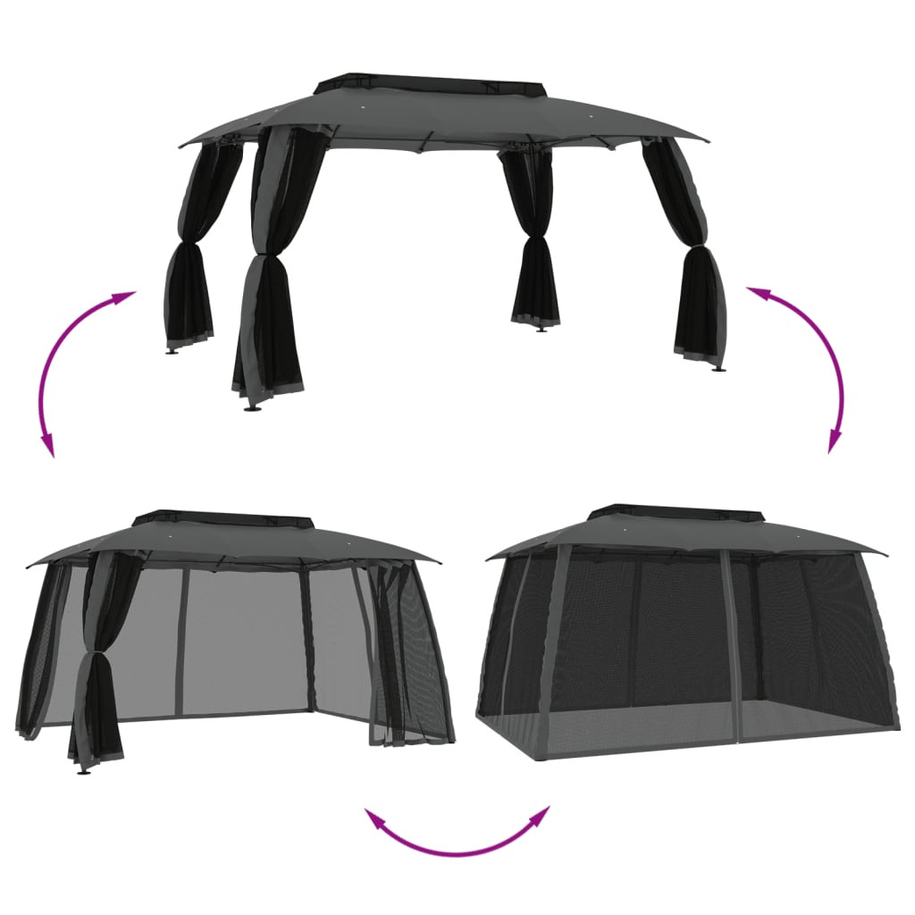 - 2 szintes szellőzős tetőkialakítás: A pavilon elegáns, kétrétegű kialakítású a kiváló szellőzés és stabilitás érdekében, így hűsölhet a napsütéses napokon és ellenáll a szélnek rossz időben.
