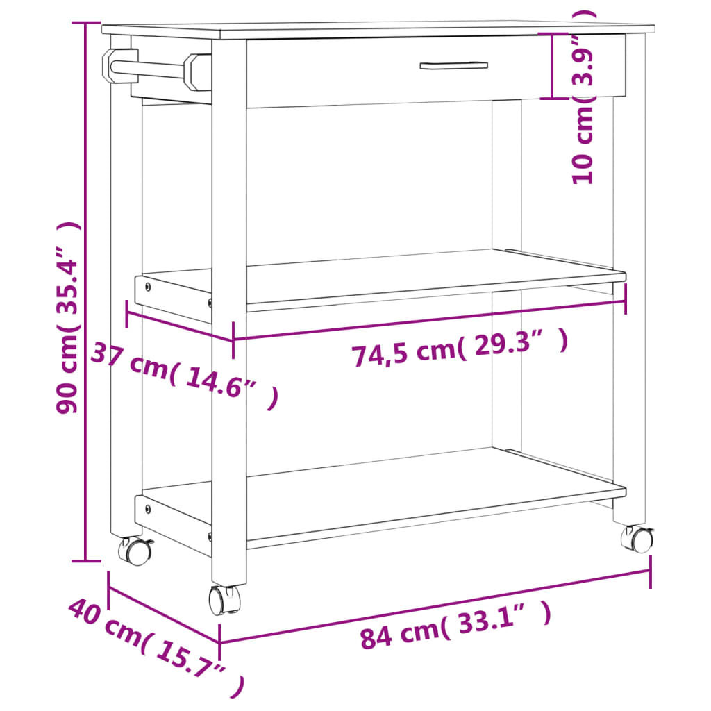 - Strapabíró anyag: A tömör fenyőfa egy gyönyörű természetes anyag. A fenyőfa egyenes erezetű, a csomók pedig jellegzetes, rusztikus megjelenést biztosítanak az anyagnak. A tömör fenyőfából készült konyhai tárolókocsi tartós és robusztus.