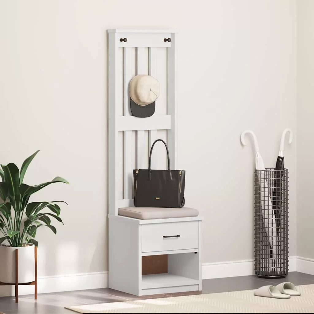 - Többfunkciós előszobapad: Ez a sokoldalú pad cipőtároló szekrényként is funkcionál, miközben kényelmes ülőhelyet biztosít, amikor a folyosón cipőt vesz vagy vesz fel.