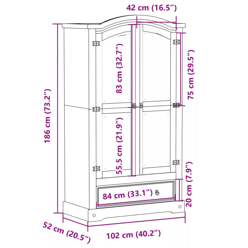 Ez a klasszikus stílusú faszekrény bőséges tárolóhelyet biztosít ruhái, cipői és kiegészítői rendezett tárolásához.