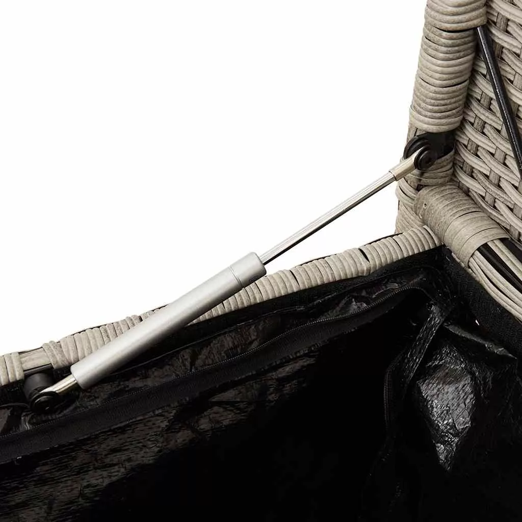 - Tárolási funkció: A kerti szék alatt tárolóhely található, amely vízálló zsákkal van ellátva a párnák, játékok és egyéb tárgyak tárolására. A belső táska biztonságosan rögzíthető az üléshez a kampós rögzítőkkel, így biztosítva a stabilitást és megakadályozva az elmozdulást.