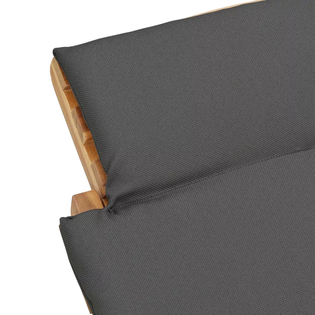 - Felhasználható elemek: Vastag, időjárásálló üléspárnával van felszerelve, ami folyamatos kényelmet biztosít. A sima keret és a támogató háttámla kényelmes fekvést nyújt, a szövetpántok pedig tartják a párnát a helyén.
