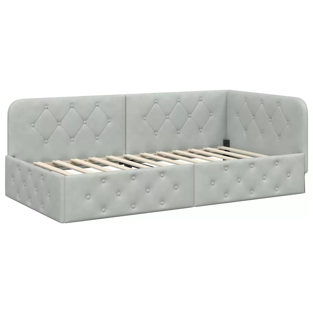 - Modern stílus: Tiszta vonalak és egyszerű L-alakú formája tűnik ki, ez a sarokágykeret a modern és minimalista irányzatokat követi. A bársony kárpit mélységet ad a dizájnnak, így könnyen illik különböző hálószoba bútorokhoz és díszítőelemekhez.