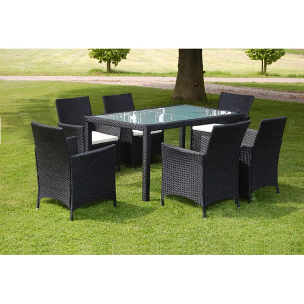 - A szállítmány 1 üveglapos asztalt, 6 rattan széket és 6 levehető párnát tartalmaz.