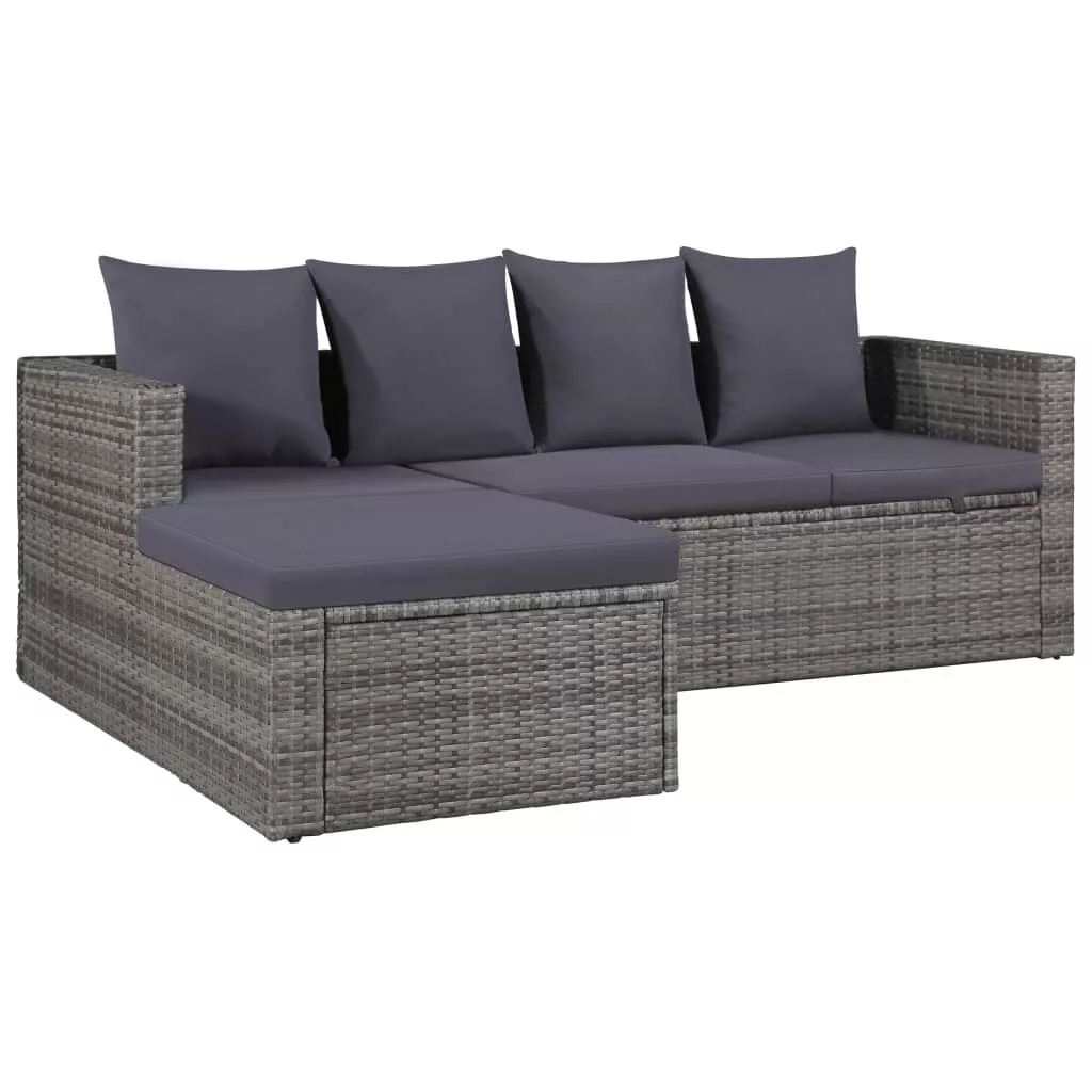 A szett 1 db sarokkanapét, 1 db dohányzóasztalt, 2 db puffot, 4 db párnát és 6 db ülőpárnát tartalmaz.