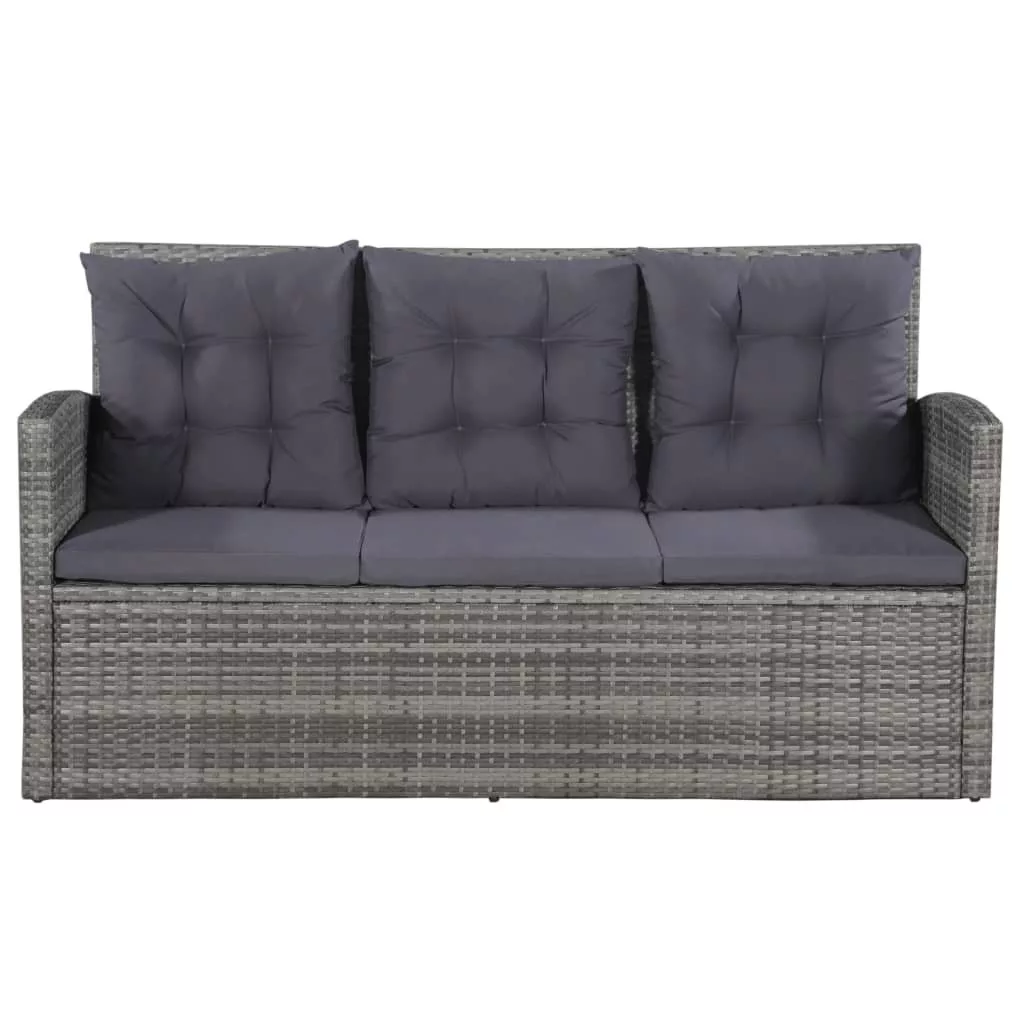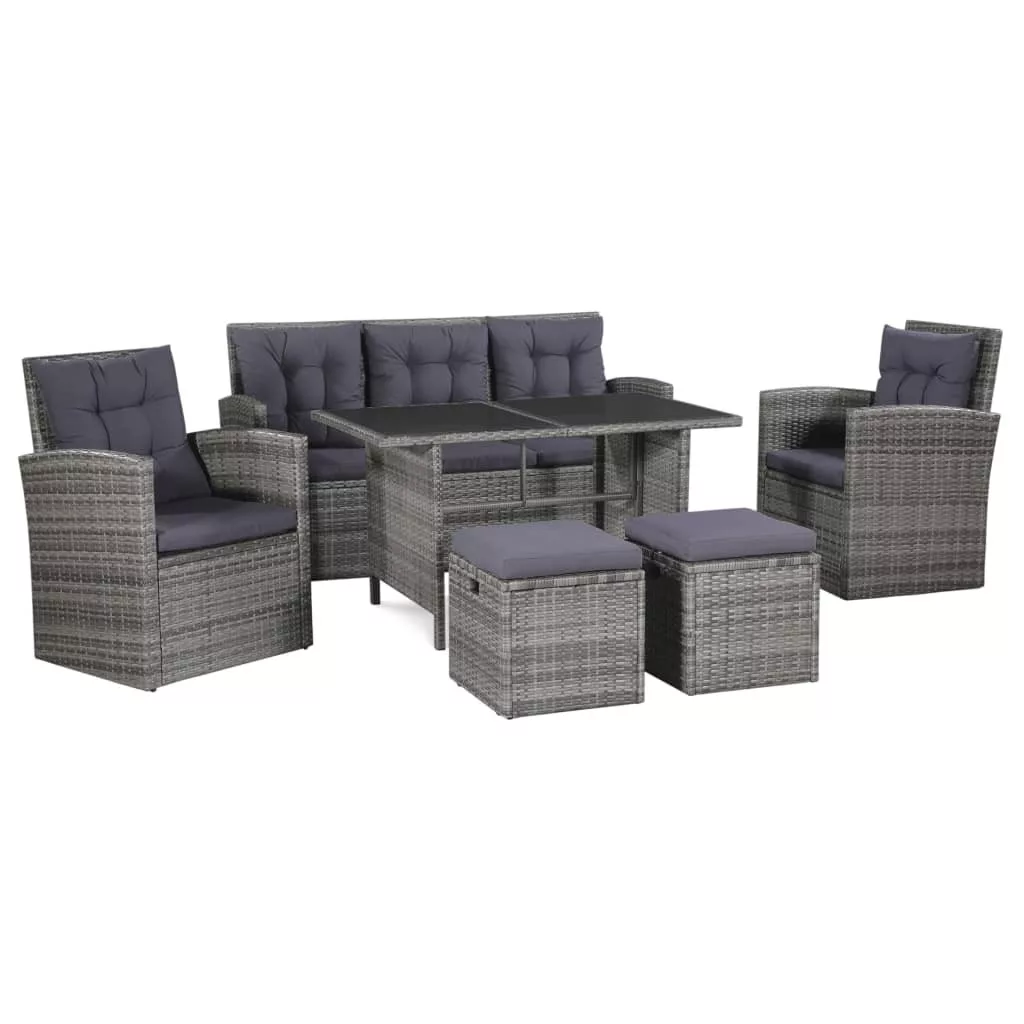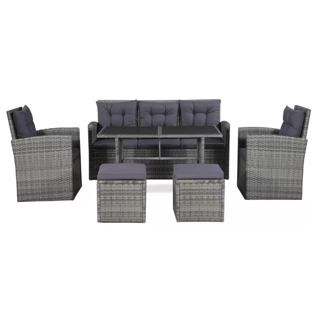 Ez a polyrattan ülőgarnitúra - amelybe 1 háromszemélyes kanapé, 2 fotel, 1 asztal, 2 lábzsámoly, 5 hátpárna és 7 ülőpárna tartozik - kertjében vagy verandáján stílusos ülőhelyet biztosít.