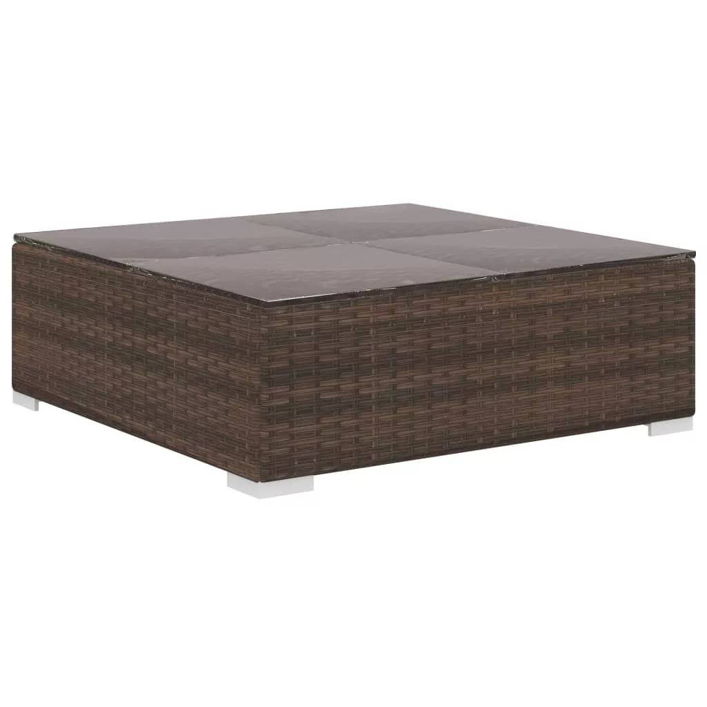 A szett 1 sarokkanapét, 5 középső kanapét, 1 zsámolyt, 1 üvegtetejű dohányzóasztalt, 1 kis tálalóasztalt, 1 nagy tálalóasztalt, 7 ülőpárnát és 7 hátpárnát tartalmaz. Megjegyzés: A szett minőségének megőrzése érdekében javasoljuk, hogy eső, hó vagy fagy esetén takarja le.