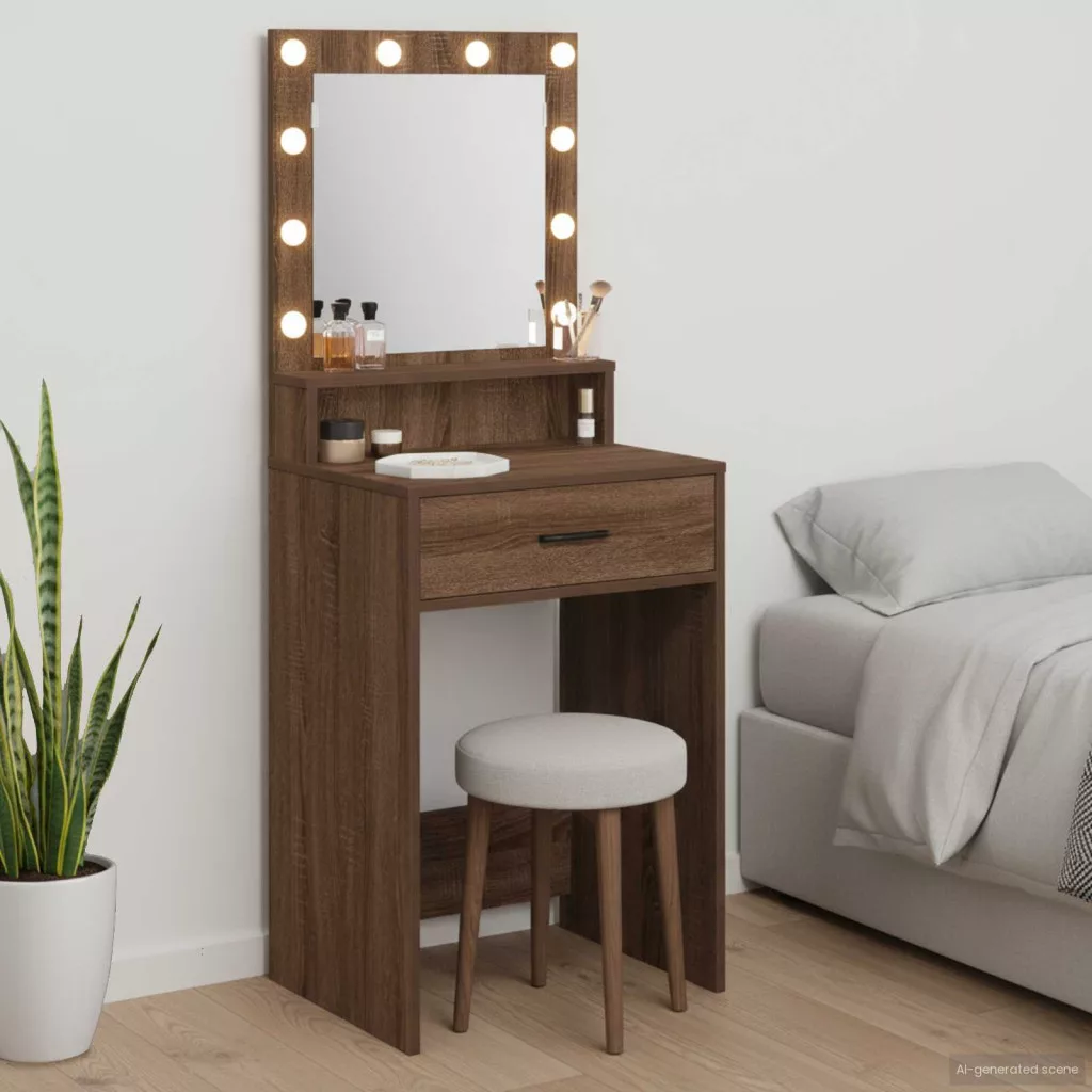 - Integrált világítás: Az asztal LED világítással van felszerelve, így minden sminkelés során tökéletes fényt biztosít. A praktikus nyomógomb egyszerűsíti a használatot, hogy még kényelmesebb legyen az öltözködés.