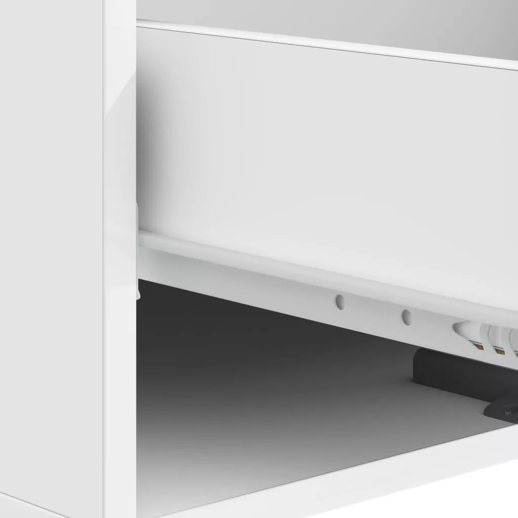 - Fotó különböző szögből: Tágas rekesze és polca bőséges tárolási lehetőséget kínál. Az integrált tárolás segít a könyvek és távirányítók rendezett tárolásában, így megtartva a rendet. A nyitott elrendezés miatt mindent könnyen elérhetsz, így praktikus és szép is bármilyen helyiségben.