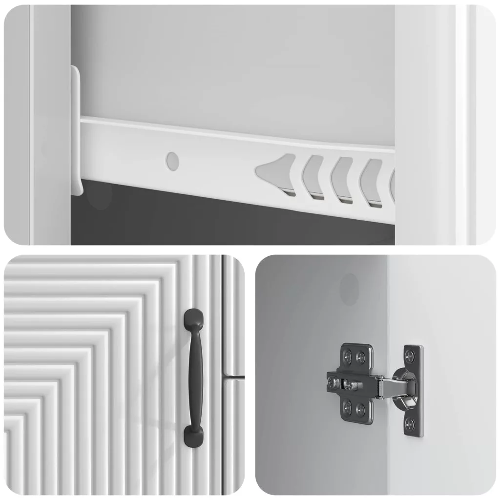 - Tartozékok: Különböző, megemelt lábakkal lett megalkotva, amik karcsú támaszt nyújtanak. A polcok, a mérnöki fa ajtók és a megbízható bárfogantyú dizájn kombinációja megkönnyíti a tárolás elérését, optimalizálva a használhatóságot.