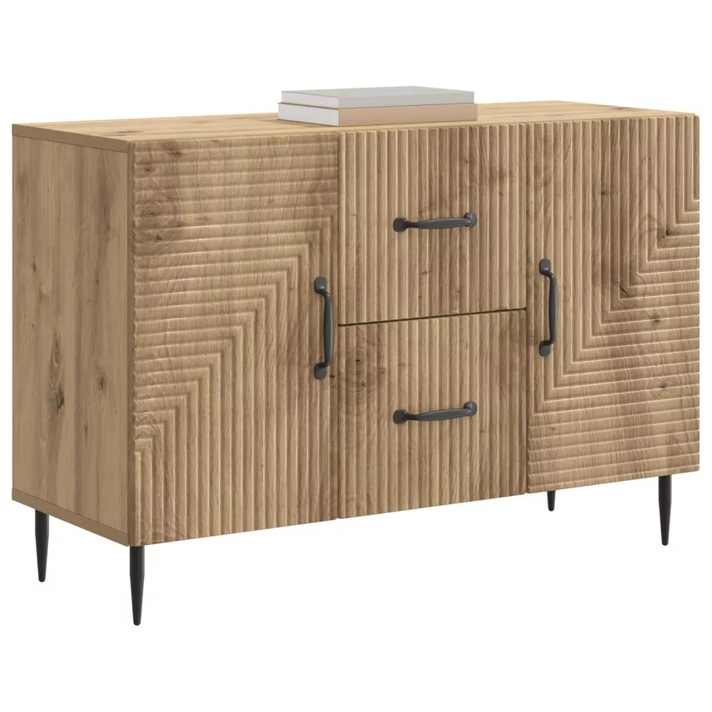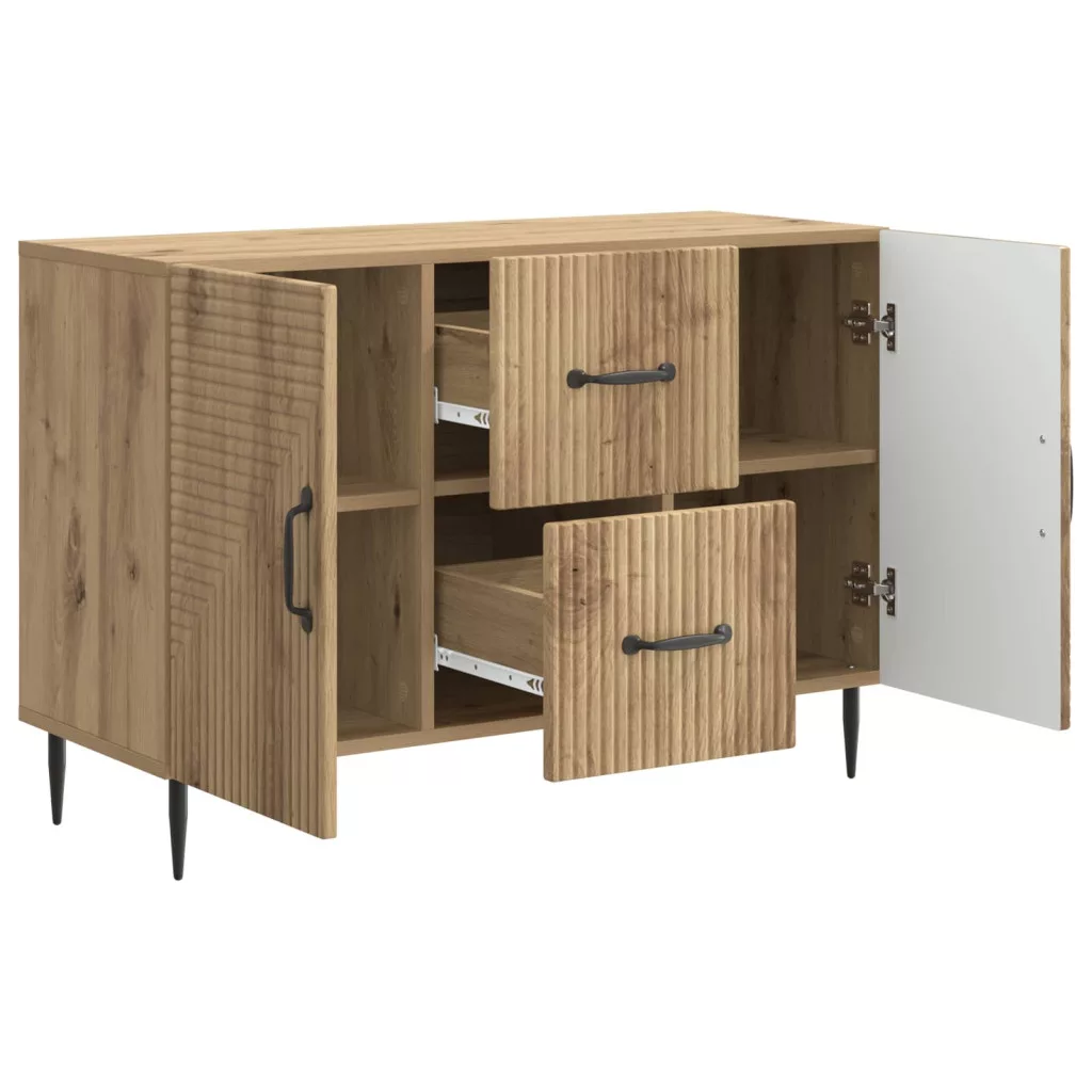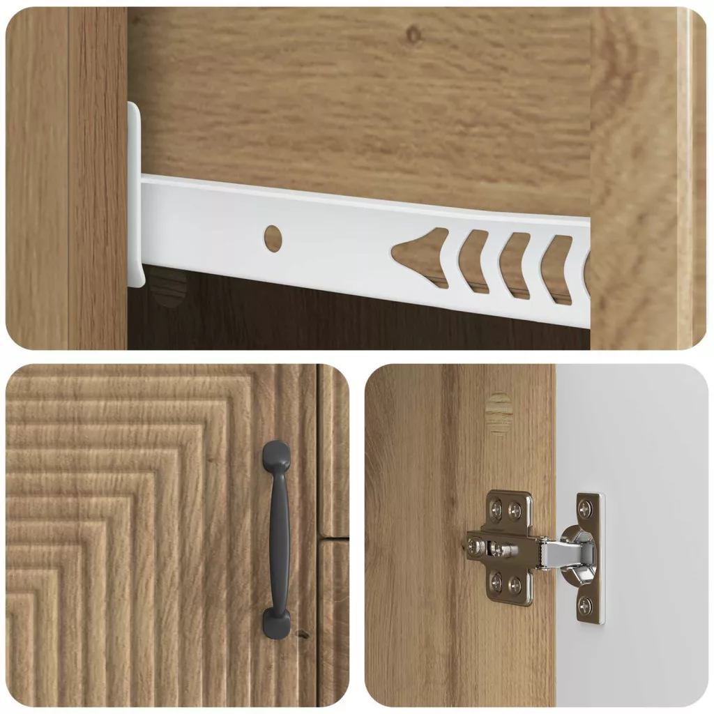 - Tartozékok: Különböző, megemelt lábakkal lett megalkotva, amik karcsú támaszt nyújtanak. A polcok, a mérnöki fa ajtók és a megbízható bárfogantyú dizájn kombinációja megkönnyíti a tárolás elérését, optimalizálva a használhatóságot.