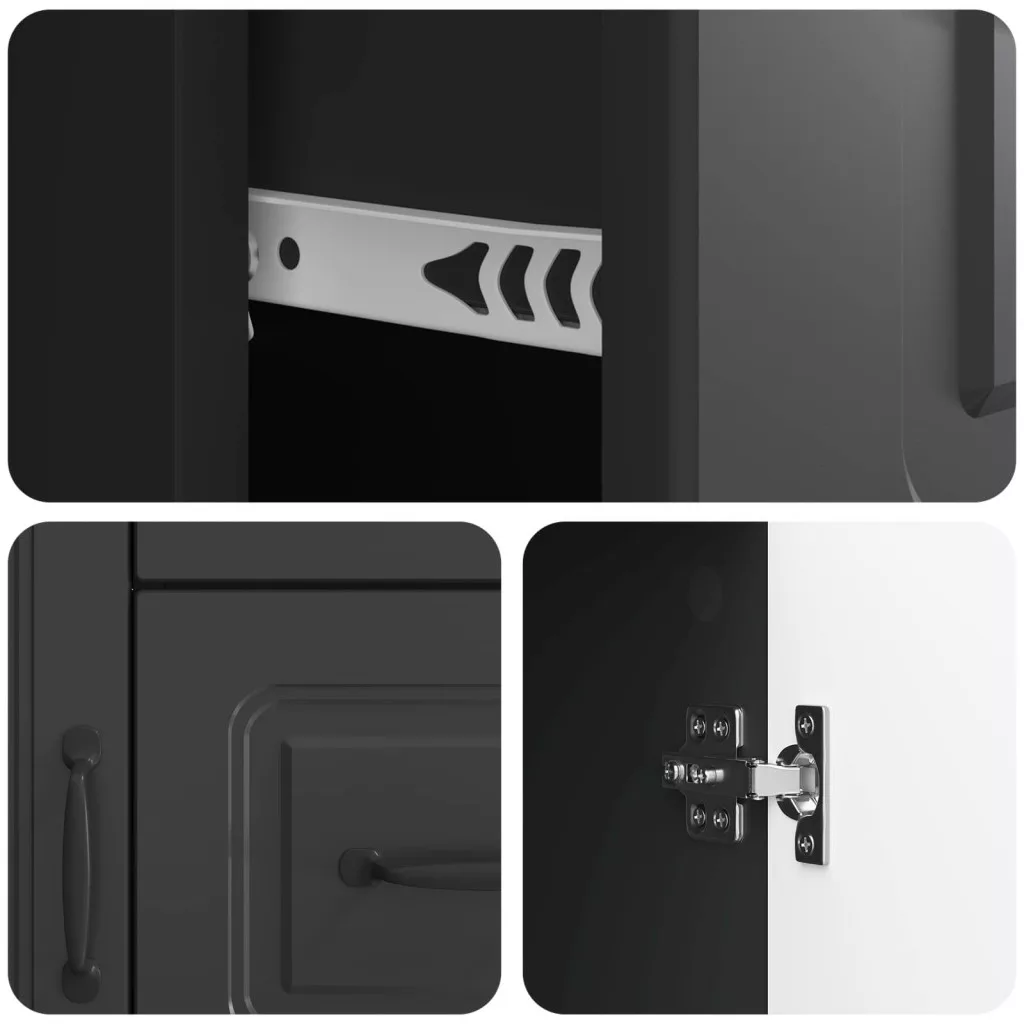 - Stílusos fogantyúk A tálalószekrény elegáns íj fogantyúkkal van ellátva, ami a modern dizájnt ötvözi a funkcionalitással. A fogantyúk kényelmes fogást adnak, így az ajtók és a fiókok könnyedén nyithatók.