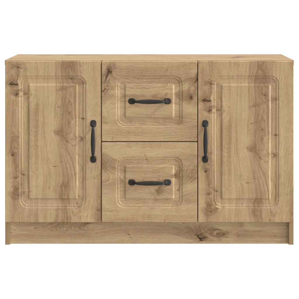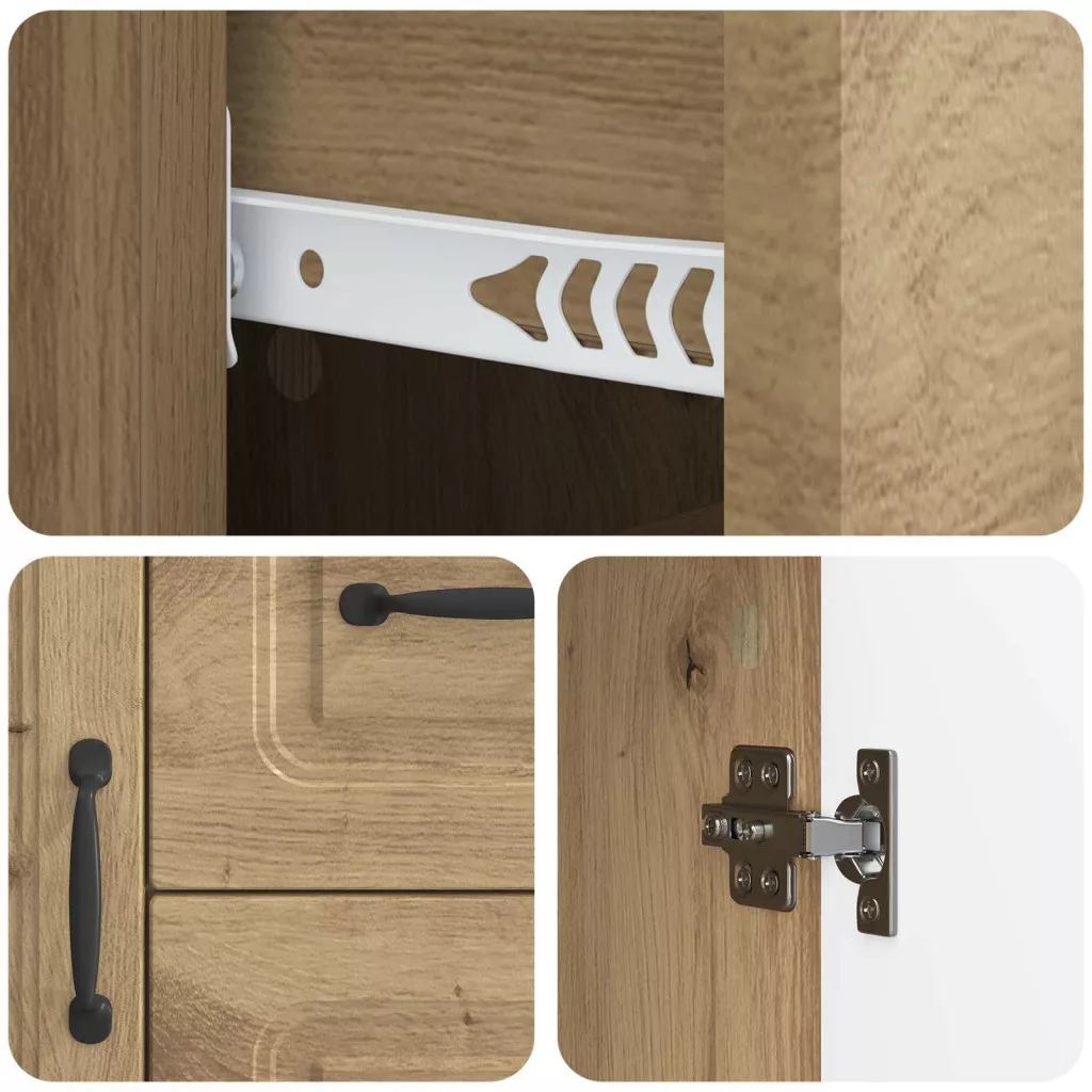 - Beépített komponensek: A tálalószekrény deszkapolcokat és fiókokat tartalmaz, rengeteg tárolási lehetőséget kínálva. Minőségi fémből készült ívfogantyúi könnyű hozzáférést biztosítanak, miközben stílusos kontrasztot adnak a fa szerkezethez. A fogantyúk kényelmesek, ideálisak a mindennapi használatra. Továbbá, a 90°-os ajtók megkönnyítik a tárolt tárgyak elérését.