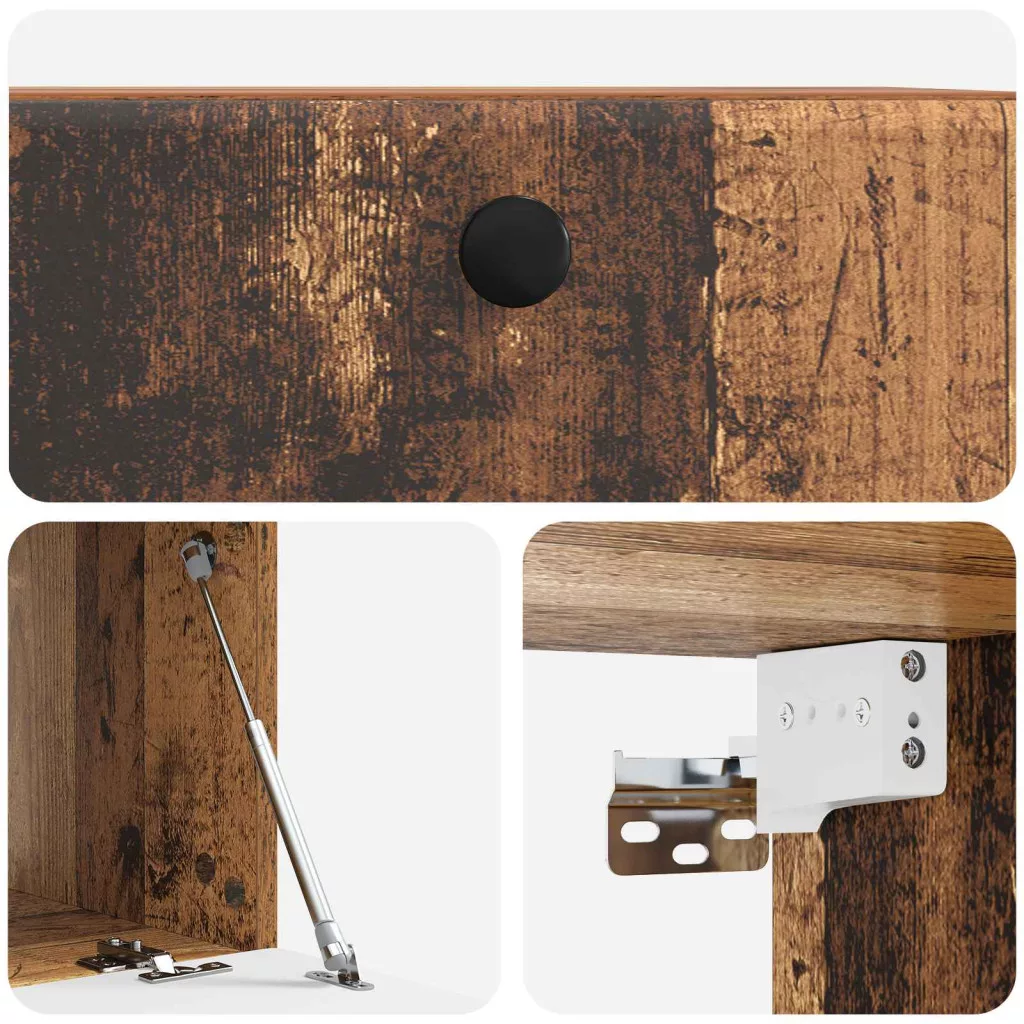 - Szállított elemek: 90°-ban nyíló ajtókkal, a szekrény praktikus fém csavarokkal van felszerelve, amelyek megkönnyítik a tárolók elérését. Minden alkatrész gondosan megtervezett, biztosítva a egyszerű használhatóságot anélkül, hogy rendetlenséget okozna. A falra szerelhető dizájn a maximális padlófelület kihasználására összpontosít, így kifogástalanul illeszkedik a nappalikba.