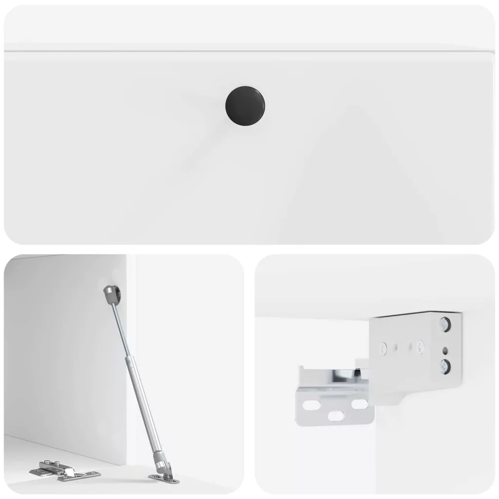- Szállított elemek: 90°-ban nyíló ajtókkal, a szekrény praktikus fém csavarokkal van felszerelve, amelyek megkönnyítik a tárolók elérését. Minden alkatrész gondosan megtervezett, biztosítva a egyszerű használhatóságot anélkül, hogy rendetlenséget okozna. A falra szerelhető dizájn a maximális padlófelület kihasználására összpontosít, így kifogástalanul illeszkedik a nappalikba.