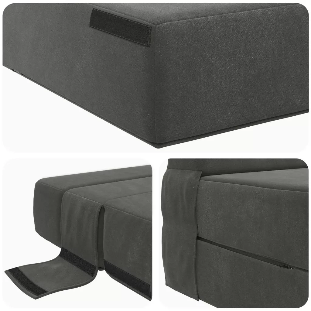 - Biztonságos és stabil beállítás: A kanapéágy tépd-záras rögzítőket tartalmaz, amelyek megakadályozzák, hogy elmozduljon, így biztosítva a stabilitást akár kanapéként, akár ágyként használod. Ezek a zárások egyszerűsítenek a használaton, csökkentve az aggodalmakat a helyzetbeállítással kapcsolatban.