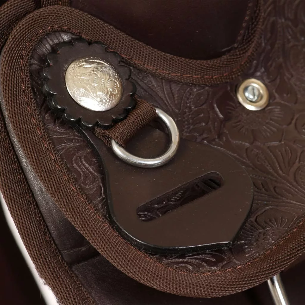 A kiváló minőségű bőr és műbőr, melyet dombornyomásos virágminta díszít, nemcsak dekoratívvá, hanem praktikussá is varázsolja a nyerget. A western nyereg a strapabíró-képesség növelése érdekében minden nyomásponton meg lett erősítve. A bőr kengyelek a hevedertartó szíjakhoz és a hevederekhez hasonlóan masszívak és kopásállók. A nyereg a ló és lovas számára is egyaránt rendkívül kényelmes, így akár hosszú órákon át is lovagolhatunk benne ülve.