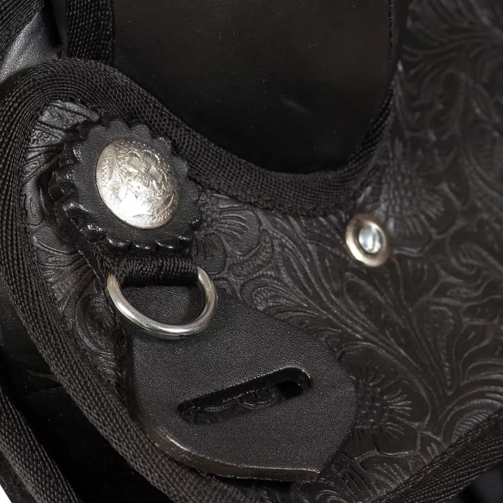 A kiváló minőségű bőr és műbőr, melyet dombornyomásos virágminta díszít, nemcsak dekoratívvá, hanem praktikussá is varázsolja a nyerget. A western nyereg a strapabíró-képesség növelése érdekében minden nyomásponton meg lett erősítve. A bőr kengyelek a hevedertartó szíjakhoz és a hevederekhez hasonlóan masszívak és kopásállók. A nyereg a ló és lovas számára is egyaránt rendkívül kényelmes, így akár hosszú órákon át is lovagolhatunk benne ülve.