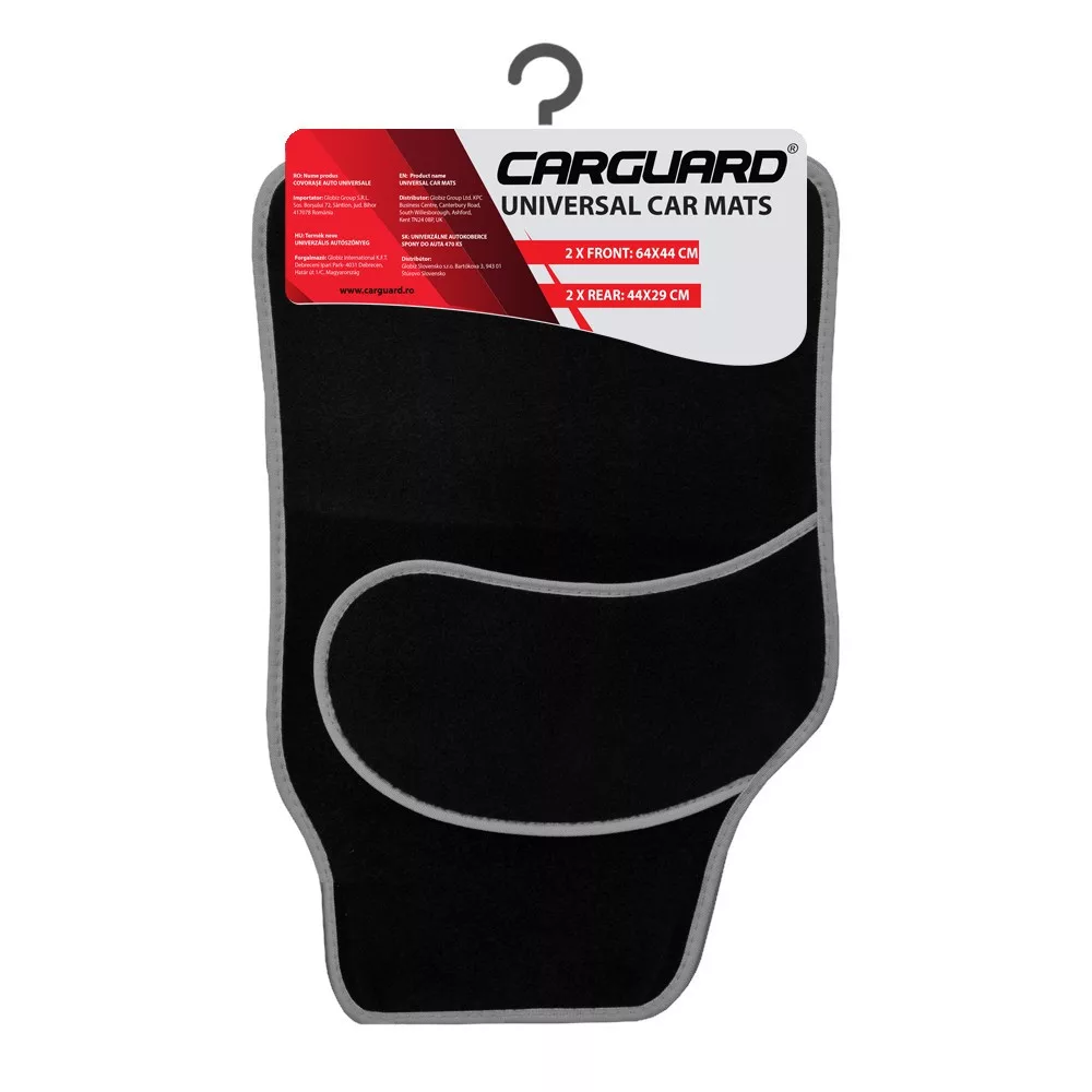 Univerzális, textil autószőnyeg készlet, amely fekete színű, szürke körvonallal és különféle típusú járművekhez készült. A minőségi textilből készült padlószőnyegek elegáns megjelenést és belső védelmet biztosít autójának. A csúszásgátló csapokkal ellátott gumírozott hátlap biztosítja a stabilitást és megakadályozza a szőnyegek elmozdulását vezetés közben.