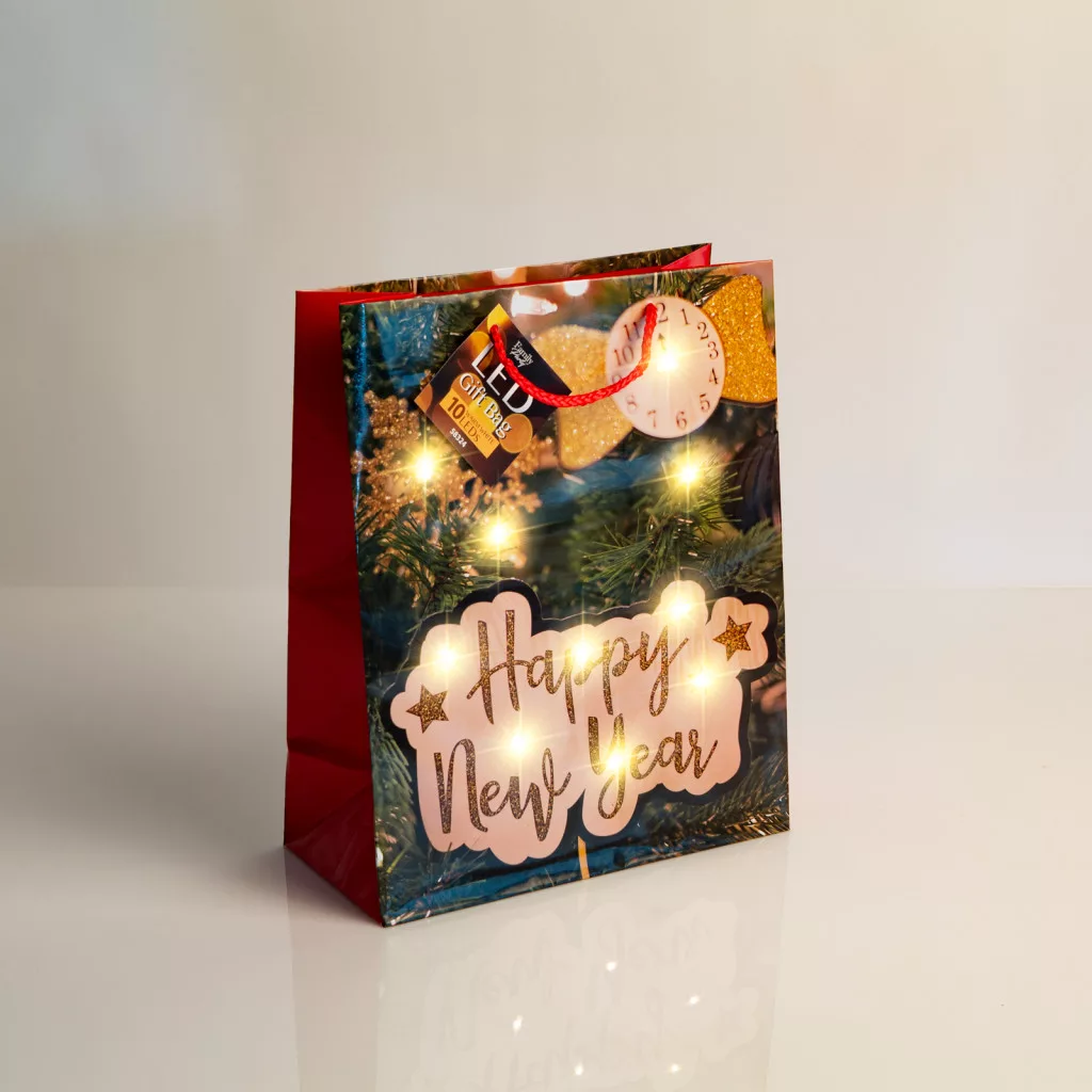Az ajándéktasak oldalát különleges minta díszíti és kiváló minőségű papírból készült, hogy hosszútávon is tökéletesen szolgáljon. A tasakon elhelyezett LED-ek különleges hangulatot teremtenek, melyek energiájáról a beépített elemek gondoskodnak.