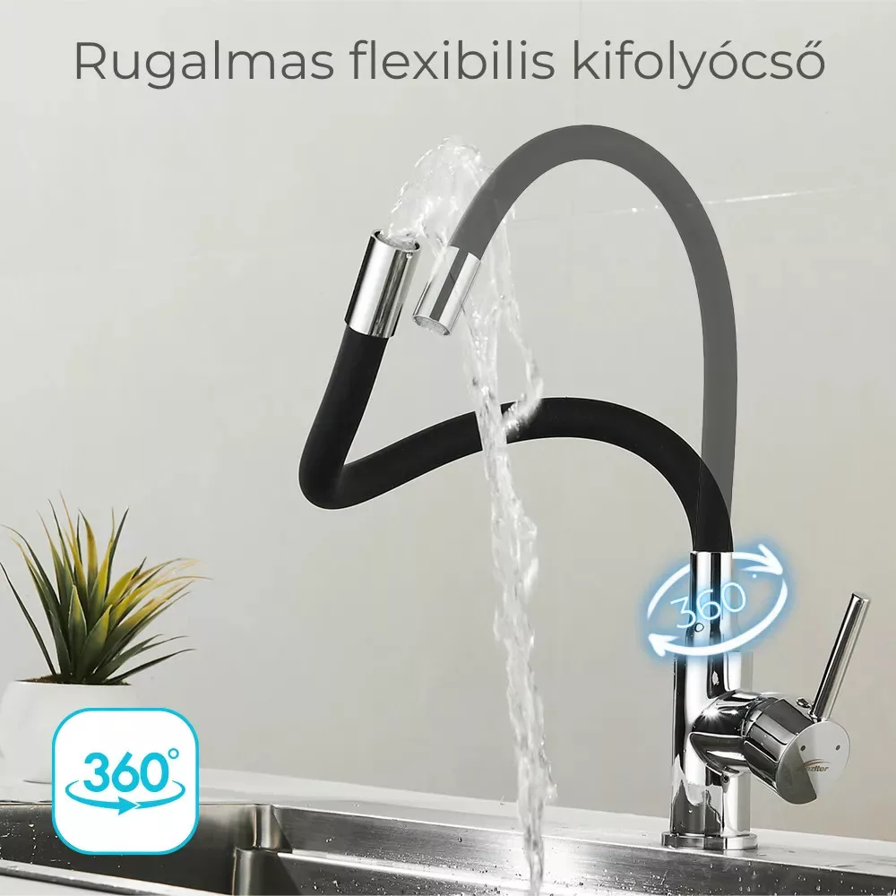 A fekete és króm színek elegáns megjelenést biztosítanak, miközben a rugalmas, 360°-ban forgatható kifolyócső maximális szabadságot nyújt a konyhai mindennapokban.