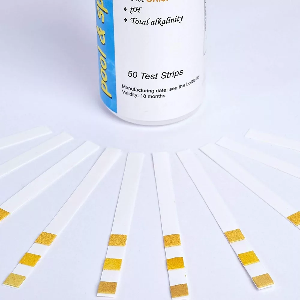 Mérőcsík készlet 50 darabos csomagban, szabad klór, lúgosság és pH mérésére.