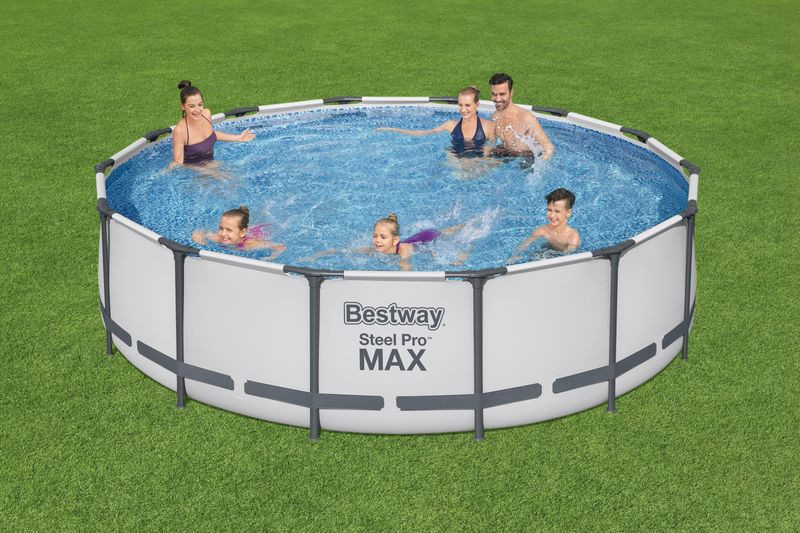 Fémvázas medencetest, 2 m³/h teljesítményű papírszűrős vízforgatóval. Az erős PVC medence testet csőváz tartja, amelyek a testen kialakított füleken keresztül tolva merevítik a szerkezetet.