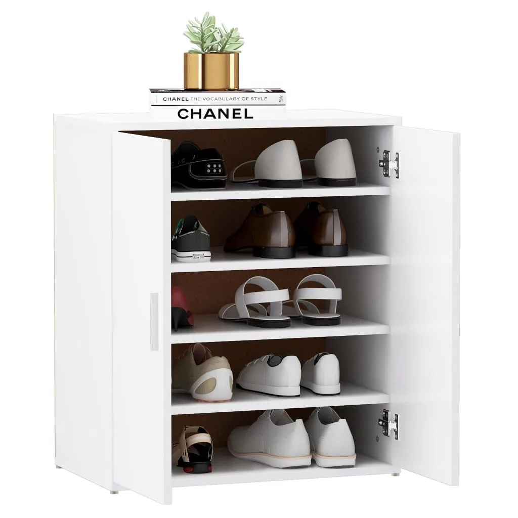 Ez a masszív forgácslapból készült előszobai szekrény rendkívül erős és tartós. A cipőállvány 5 polccal rendelkezik, melyek bőséges helyet kínálnak cipői rendezett tárolásához. A 2 ajtónak köszönhetően a cipőtároló megóvja cipőit a portól, valamint nem engedi, hogy szem előtt legyenek. Emellett saját igényei szerint rögzítheti a földre vagy a falra.