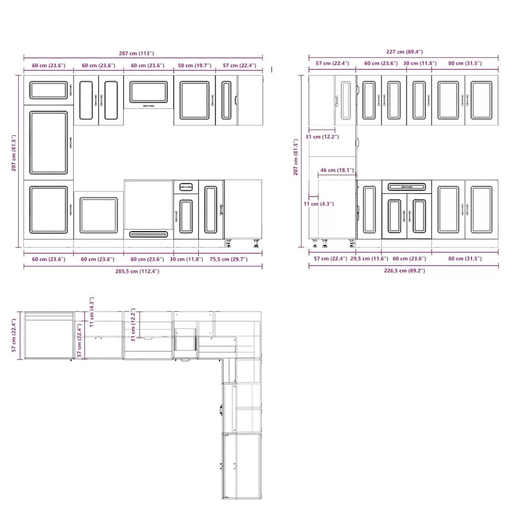 - 1 x konyhai sarokszekrény: 75,5 x 75,5 x 81,5 cm (Sz x D x K)