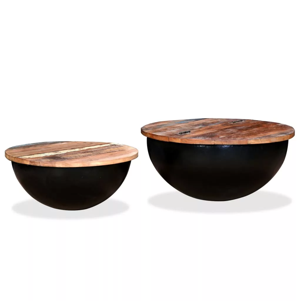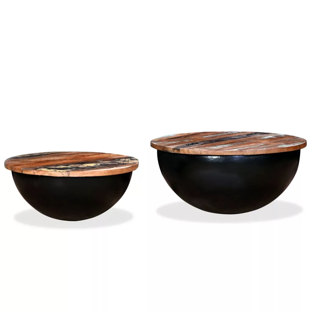 Ez a szett 2 db elegáns fa dohányzóasztalból áll, melyek egyedi, ipari dizájnt kaptak és otthona különleges kiegészítői lehetnek. Az egyedi, tál alakú acél talp mindkét asztalnak ipari külsőt kölcsönöz.