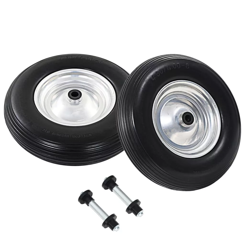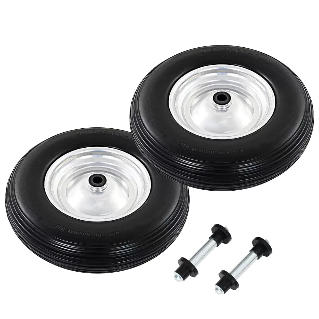 A tömör abroncsok tartós, kopásálló poliuretán elasztomerből vannak; speciális bordázatuk nagyobb sebességnél extra tapadást biztosít. A felnik erős fémből készültek. A pótkerekek egységes méretűek, és egyszerűen felszerelhetőek talicskára, molnárkocsira, kézikocsira stb.