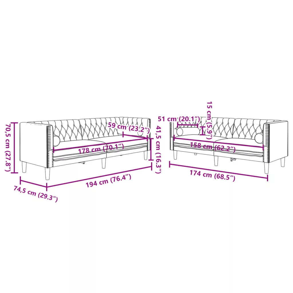 - Chesterfield stílus: A klasszikus gombokkal tűzdelt háttámlával és karfákkal, valamint az egységes hát- és karmagassággal a kanapé minden helyiséget feldob, stílust és kényelmet biztosítva.