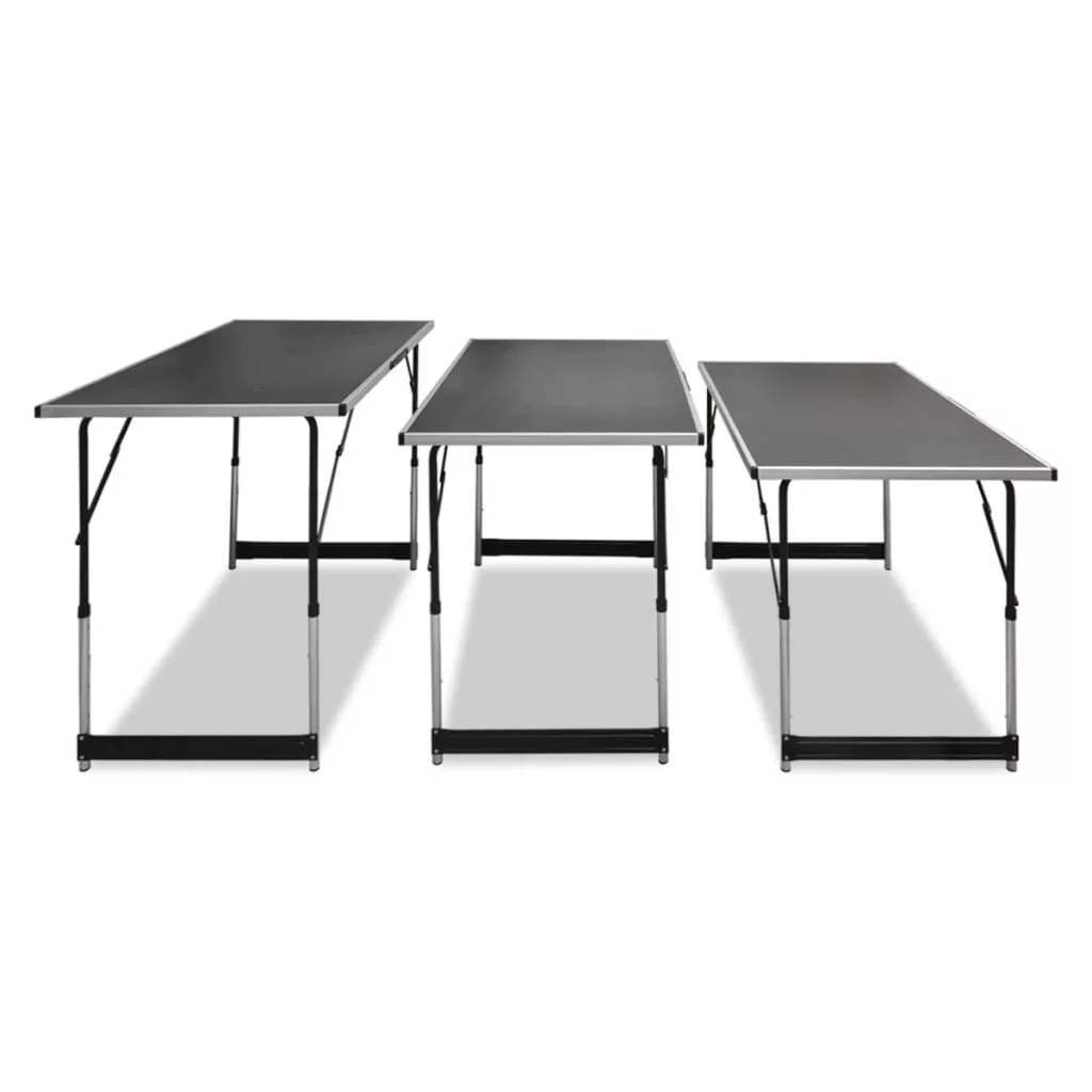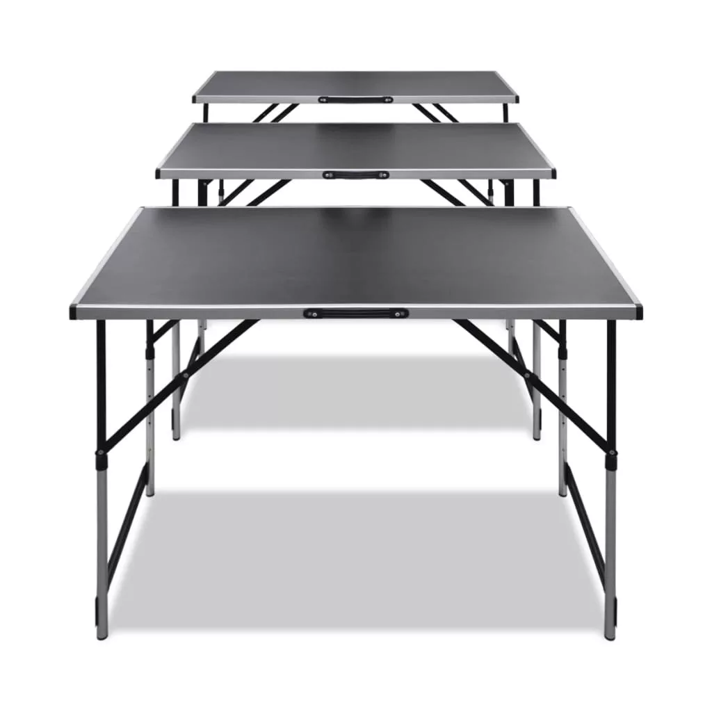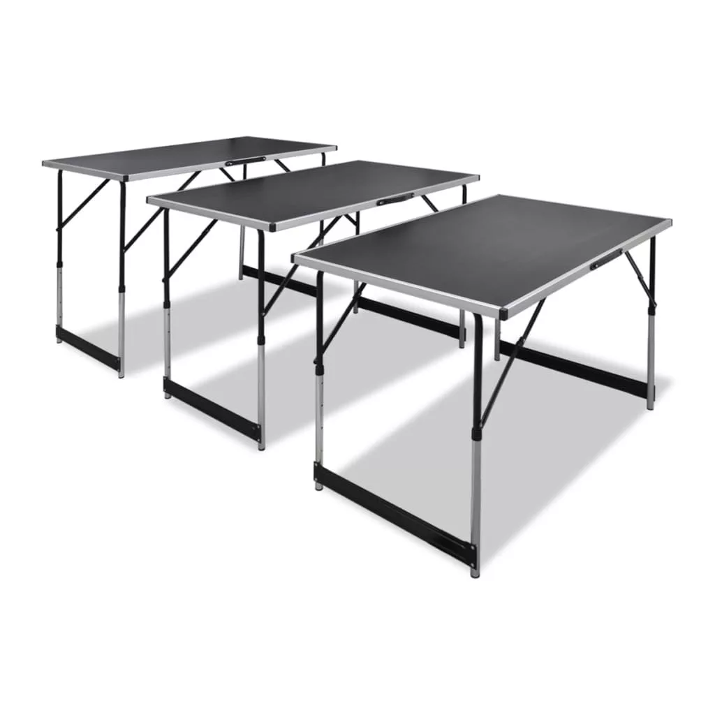 Ez a három asztal a mellékelt kampók segítségével összeilleszthető. Mindhárom asztal összecsukható a szállításhoz és használaton kívül könnyen eltárolható.