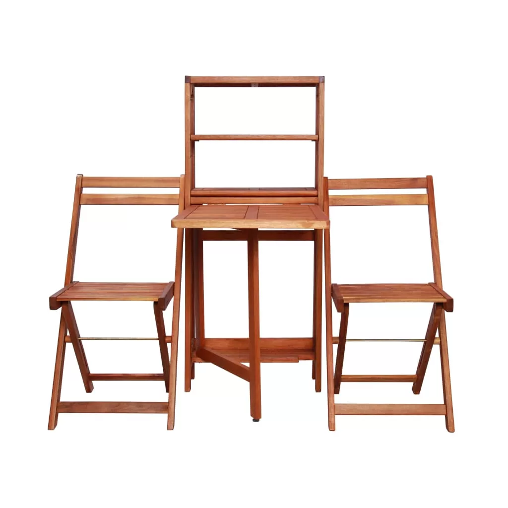 A tömör akácfából készült szett időjárásálló és rendkívül tartós. A tárolóállvány egyedi és funkcionális kialakítású: igény szerint asztalként vagy tárolópolcként is használható. A székek összecsukhatók és az asztali egységben tárolhatók, így használaton kívül helytakarékosak. A bisztró szett könnyen összeszerelhető.